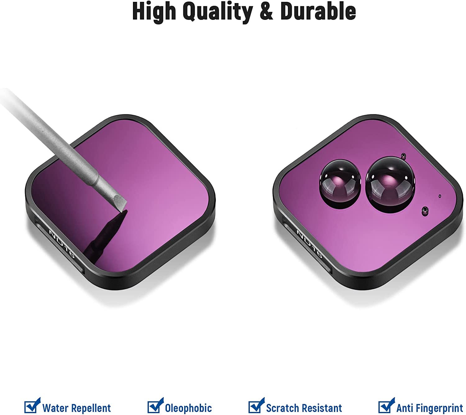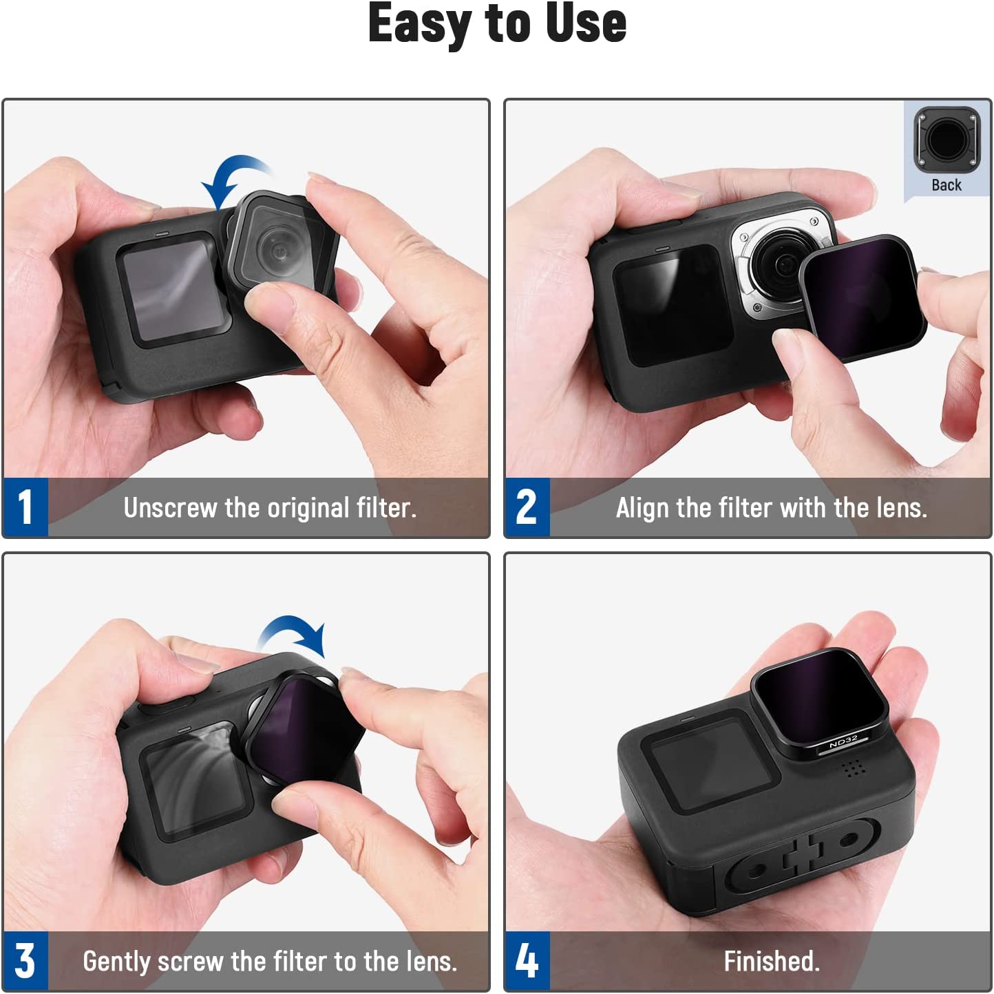- 【Easy to Use】Unscrew the original filters counterclockwise, then turn the filter clockwise to allow a quick swap to another filter. This filter kit helps to get crystal clear pictures and videos efficiently during climbing, cycling, skydiving, etc.