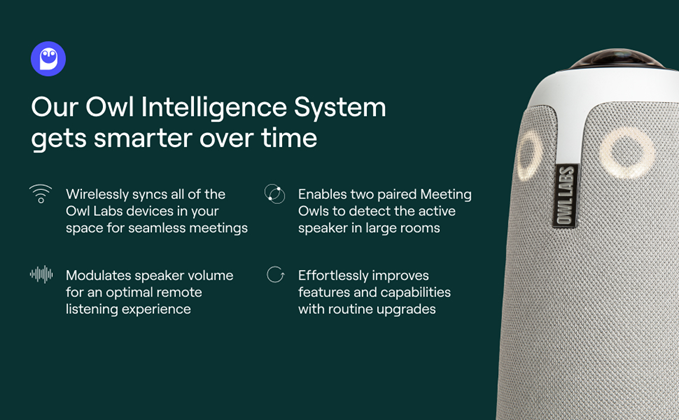 Meet the Meeting Owl 3, our premium 360-degree camera, mic, and speaker device that creates the most immersive hybrid meeting experience. Features intelligent autofocus on whoever is speaking, compatibility with most video conferencing platforms and Plug-and-Play simplicity. Built for conference rooms and classrooms with 1080p HD resolution and an 18-foot (5.5-meter) microphone pickup range. Increase the pickup range by 8 additional feet with our new Expansion Mic (sold separately). Owl Labs is an award-winning company with hardware used by over 100K organizations globally.