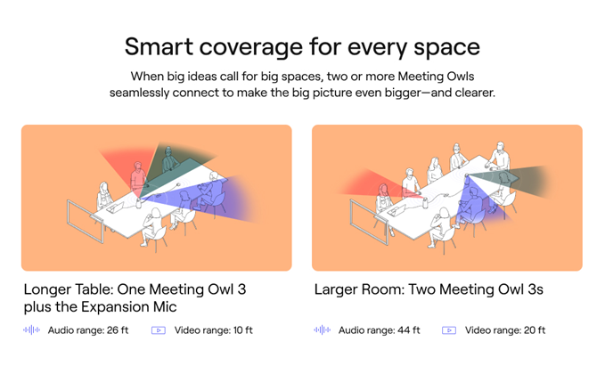 - ADAPTS TO ANY SPACE. Pair two Meeting Owls or add an Expansion Mic to expand video and audio reach in larger spaces. Compatible with Owl Labs’ Whiteboard Owl and Meeting HQ to complete your hybrid room setup.