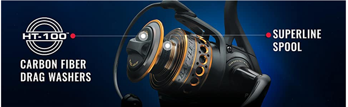 Arm yourself for the most punishing saltwater battles with the Penn Battle II Spinning Fishing Reel. Crafted from durable materials and packed with fish fighting features, this saltwater reel is engineered to catch fish year after year. From the full metal body, sideplate, and rotor to the five sealed stainless steel ball bearings, each component is designed to help you land your catch. The reel's HT 100 Versa Drag carbon fiber drag system leverages both sides of each drag washer to provide maximum drag, and its instant anti reverse bearing eliminates pullback so you reel without interruption. Additionally, the drag washers are treated with a proprietary grease to ensure long lasting performance. Suitable for use with Berkley or Spiderwire Superline, the spool is fitted with a rubber gasket that prevents the Superline from slipping under pressure meaning anglers can use braided line without a monofilament backing. And thanks to its line capacity rings, the spool displays at a glance how much line is remaining.