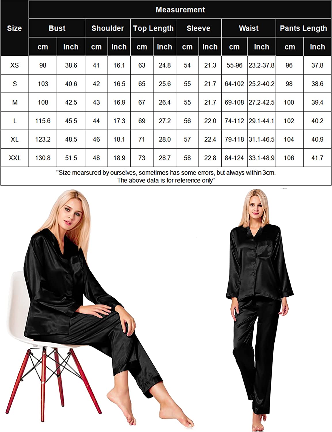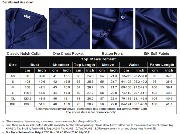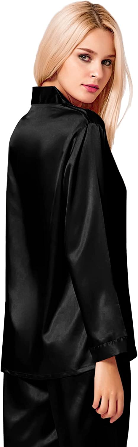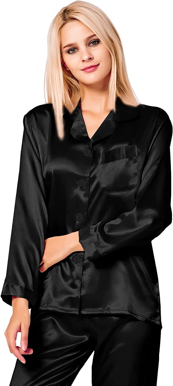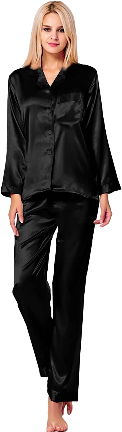 ❤ Classic Design --- Womens satin pajama set featuring classic sleepwear style:long sleeve button down shirt and long lounge pants.The ergonomic H-shaped loose design give you the ultimate comfort. Button front design make it easy to get on and off. And the notch collar top hits at hips.Pants with soft elastic waist, makes you feel relaxed and comfortable.The chest pocket allows you to store some small stuff.This satin pajamas are lightweight and cozy for nightsleep.