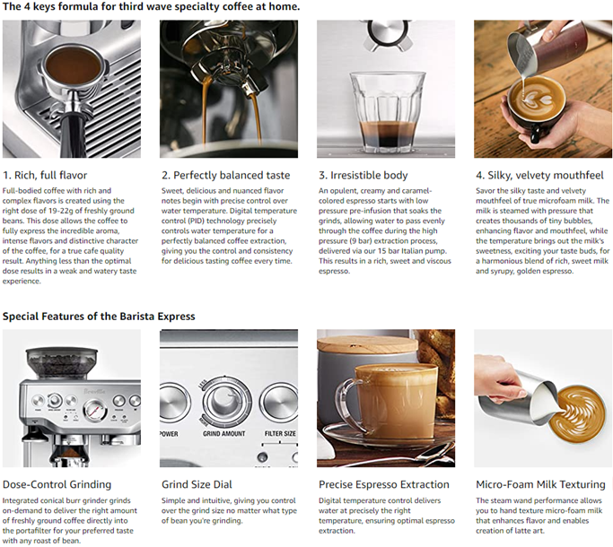 | Included Components | Integrated Tamper, Razor Dose Trimming Tool, Tablets, Stainless Steel Milk Jug, Water Filter & Filter Holder, Brush Tool & Allen Key, 1 & 2 cup Single & Dual Wall Filter Baskets, Coffee Scoop, Cleaning Disc, 54mm Stainless Steel Portafilter |