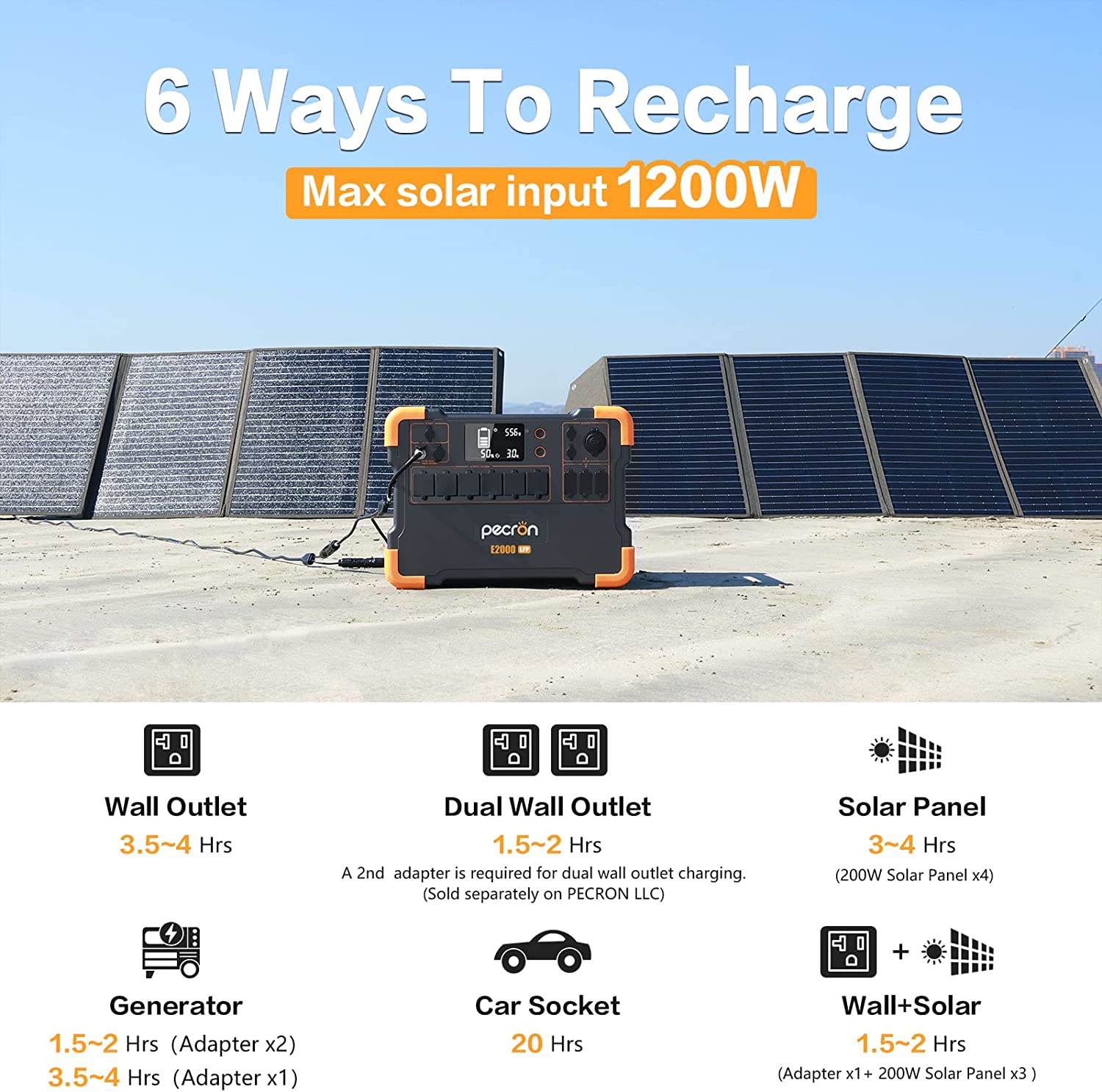 There are four ways to charge the E2000LFP, including AC(home) charging, DC(vehicle) charging, PV(solar) charging, and generator charging. You can charge the unit from different sources at the same time.
