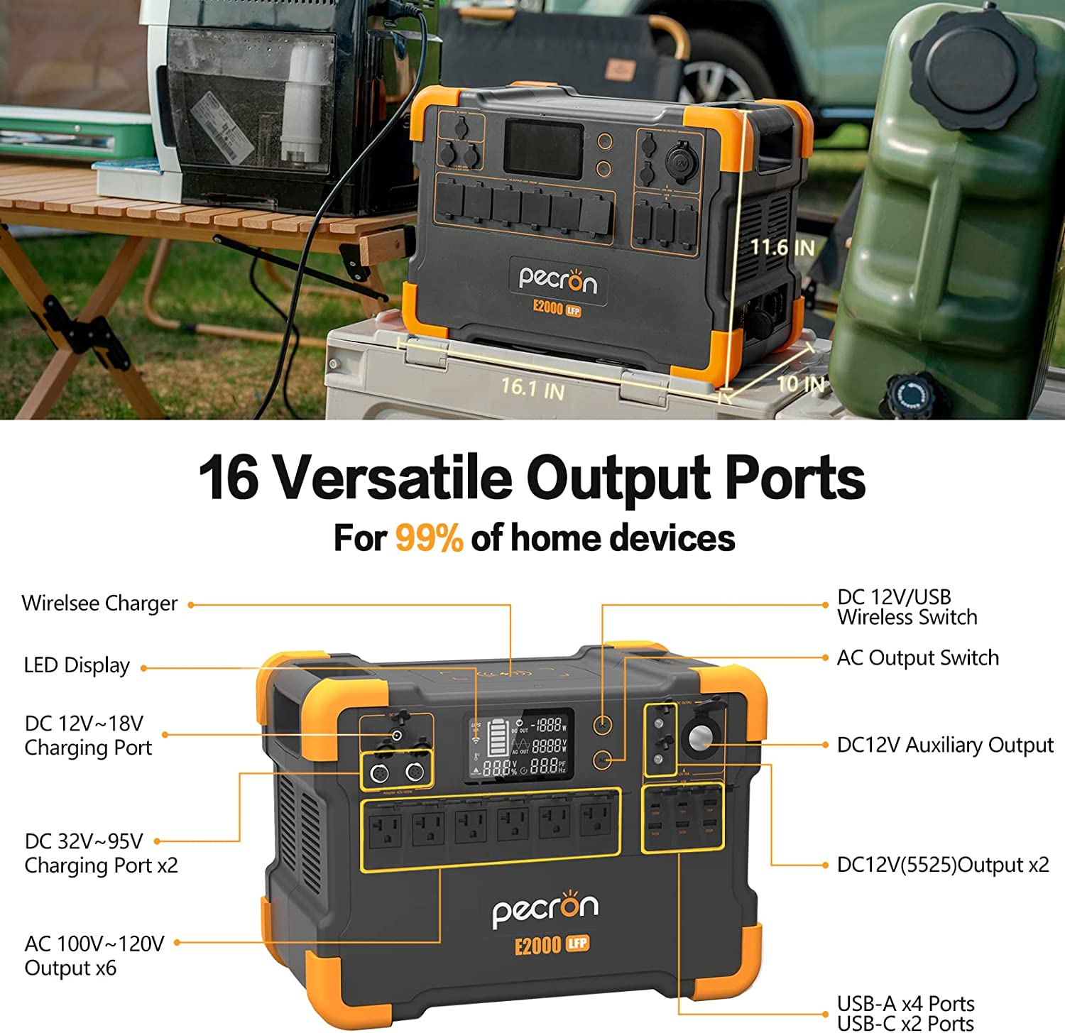 Power it ALL:E2000LFP has 16 output ports that can run up to 16 devices at a time. Including 6x 2000W AC outlets, 6x USB ports up to PD 100W, 1x Cigar port, 2x DC ports, and 1x 15W wireless charger,compatible with virtually all essential devices