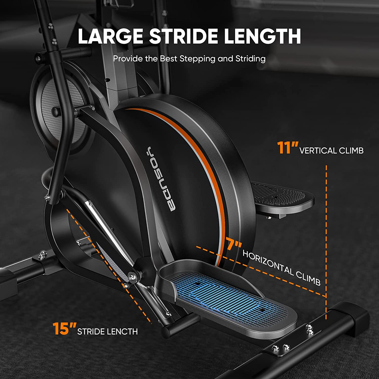 • 【3-IN-1 Home Gym Equipment】YOSUDA elliptical stepper combines the easy, low-impact motion of an Elliptical, and the cardiorespiratory improving power of a Stepper, with calorie burning power of a Treadmill. Extended vertical and horizontal stride length produces a fluid climbing motion aimed to engage your whole body.