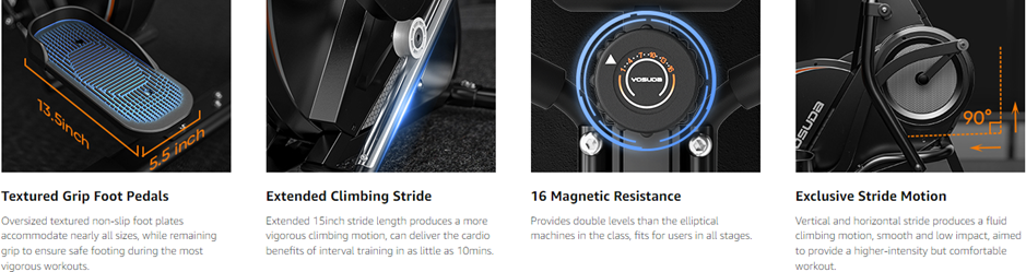 - 【3-IN-1 Home Gym Equipment】YOSUDA elliptical stepper combines the easy, low-impact motion of an Elliptical, and the cardiorespiratory improving power of a Stepper, with calorie burning power of a Treadmill. Extended vertical and horizontal stride length produces a fluid climbing motion aimed to engage your whole body.