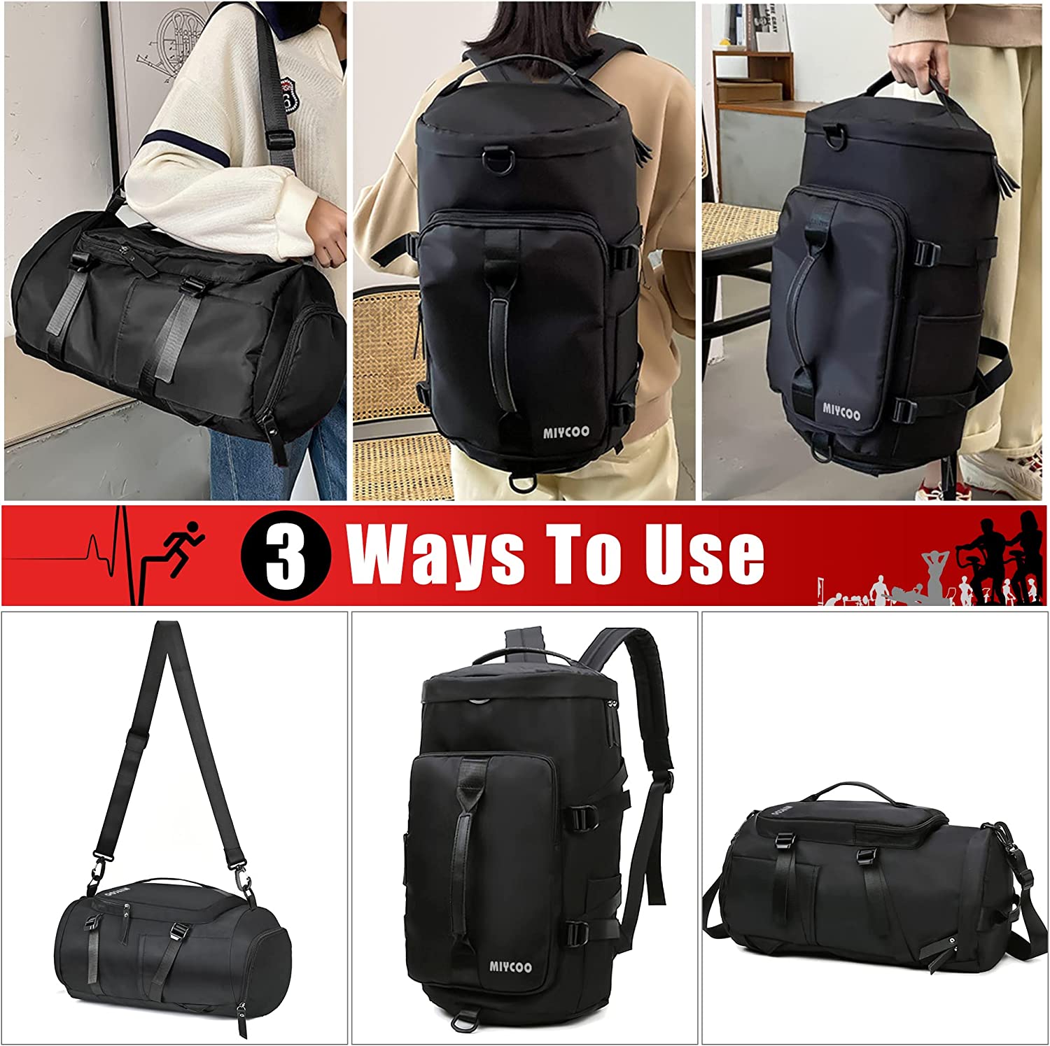 MIYCOO Gym Bag for Men and Women Sports Duffle bag Travel Backpack Weekender Overnight Bag with Shoes Compartment Black