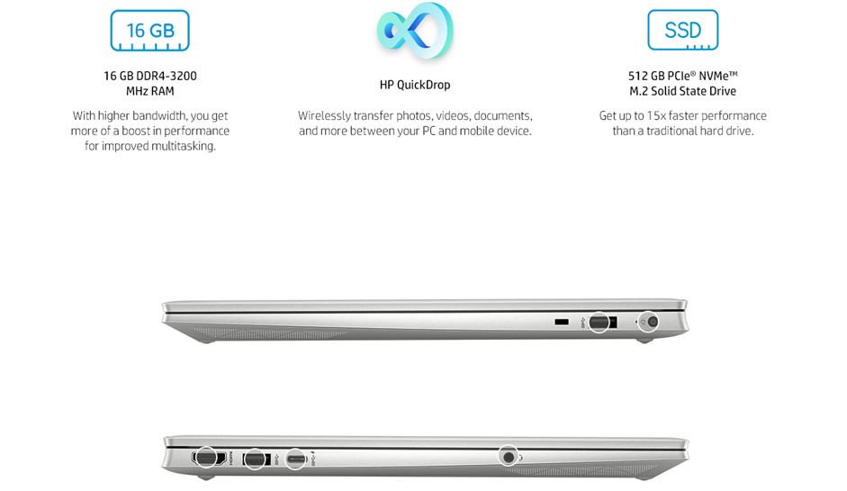 The HP Pavilion 15 Laptop has all the performance for mind-blowing entertainment you enjoy, but in a smaller, lightweight PC. The Full HD, IPS, micro-edge display combines with audio by BandO to give you robust, authentic theater-level entertainment (1). Intel Iris Xe Graphics (2) delivers the impressive performance needed for your creating, gaming, and entertainment while the 11th Generation Intel Core i7-1165G7 processor (3) gives you the instant responsiveness and best-in-class connectivity modern users crave. The HP Pavilion laptop’s 512 GB PCIe NVMe M.2 SSD storage outclasses traditional hard drives with 15 times the performance (4). Experience improved multitasking thanks to 16 GB of RAM. Work all day with up to 8 hours of battery life (5) and go from 0 to 50% charge in approximately 45 minutes with HP Fast Charge (6). Windows 10 Pro blends seamlessly and powerfully with this HP 15 Laptop for an optimized computing experience (7). Get more done with solid connection speeds from the powerful Wi-Fi 6 (2x2) (9) and Bluetooth 5.0 combo (10) and work comfortably with the familiar feel of a full-sized keyboard. Your HP laptop checks all the boxes with a 1-year limited hardware warranty, ENERGY STAR certification (12), EPEAT Silver registered (13), and a low halogen display (14). (1) Full High Definition (FHD) content is required to view FHD images. (2) Shared video memory (UMA) uses part of the total system memory for video performance. System memory dedicated to video performance is not available for other use by other programs. (3) Multi-core is designed to improve the performance of certain software products. Not all customers or software applications will necessarily benefit from the use of this technology. Performance and clock frequency will vary depending on the application workload and your hardware and software configurations. Intel’s numbering, branding, and/or naming is not a measurement of higher performance. Intel, Pentium, Intel Core, Celeron, Iris Xe, Intel logo, and the Intel Inside logo are trademarks of Intel Corporation in the U.S. and other countries. (4) Based on HP internal testing using CrystalDiskMark benchmarking software. Performance is sequentially faster (read-only) compared to traditional 5,400 rpm HDD. (5) Windows 10 MobileMark 18 battery life will vary depending on various factors including product model, configuration, loaded applications, features, use, wireless functionality, and power management settings. The maximum capacity of the battery will naturally decrease with time and usage. See bapco.com/products/mobilemark-2018/ for additional details. (6) Recharges your battery up to 50% within 45 minutes when the system is off (using “shut down” command). Recommended for use with the HP adapter provided with the notebook, not recommended with a smaller capacity battery charger. After charging has reached 50% capacity, charging speed will return to normal speed. Charging time may vary plus/-10% due to System tolerance. (7) Not all features are available in all editions or versions of Windows. Systems may require upgraded and/or separately purchased hardware, drivers, software, or BIOS update to take full advantage of Windows functionality. Windows 10 is automatically updated, which is always enabled. ISP fees may apply and additional requirements may apply over time for updates. See microsoft.com (8) Upgrade rollout plan is being finalized and is scheduled to begin late in 2021 and continue into 2022. Specific timing will vary by device. Certain features require specific hardware, see http://www.Microsoft.com/windows/windows-11-specifications (9) Wireless access point and internet service required and sold separately. Availability of public wireless access points limited. Wi-Fi 6 (802.11ax) is backwards compatible with prior 802.11 specs. The specifications for Wi-Fi 6 are draft and are not final. If the final specifications differ from the draft specifications, it may affect the ability of the notebook to communicate with other Wi-Fi 6 devices. Only available in countries where 802.11ax is supported. (10) Bluetooth is a trademark owned by its proprietor and used by Hewlett-Packard Company under license. (11) Based on Wi-Fi 5 80MHz and Wi-Fi 6 160MHz minimum requirements when transferring files between two devices connected to the same router. Requires a wireless router, sold separately, that supports 802.11ax (Wi-Fi 6). Only available in countries where 802.11ax is supported. (12) ENERGY STAR and the ENERGY STAR mark are registered trademarks owned by the U.S. Environmental Protection Agency. (13) Based on U.S. EPEAT registration according to IEEE 1680.1-2018 EPEAT. EPEAT status varies by country. (14) External power supplies, power cords, cables, and peripherals are not Low Halogen. Service parts obtained after purchase may not be Low Halogen.