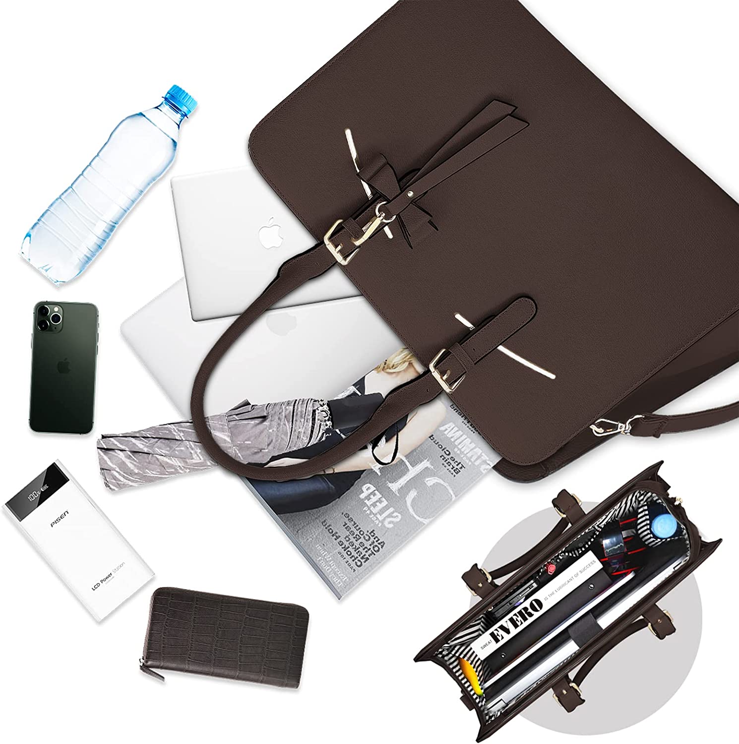 ROOMY COMPARTMENT WITH ADDITIONAL MAKEUP BAG: Totally 10 interior and exterior pockets for holding your daily necessities. 1 large main compartment with padded foam section for laptop. 1 Ipad pocket, 2 slot pockets, 2 pens pockets, 1 zipper pocket, 2 open pockets on both sides and 1 anti-theft pocket outside can hold phone, wallet, business card and other small items. The additional makeup bag with several slots is perfect for your lip sticks, brushes or USB cable, charger.
