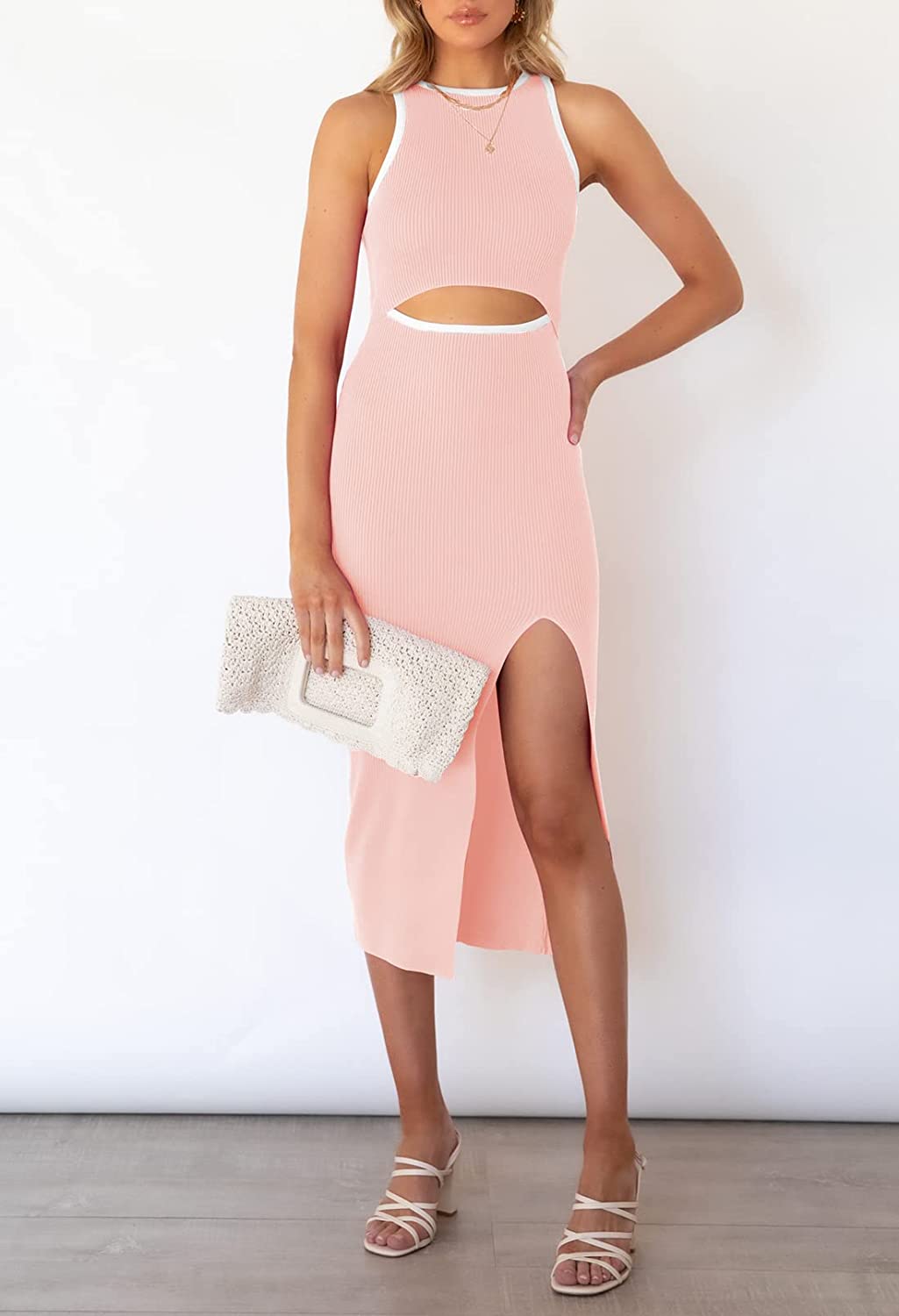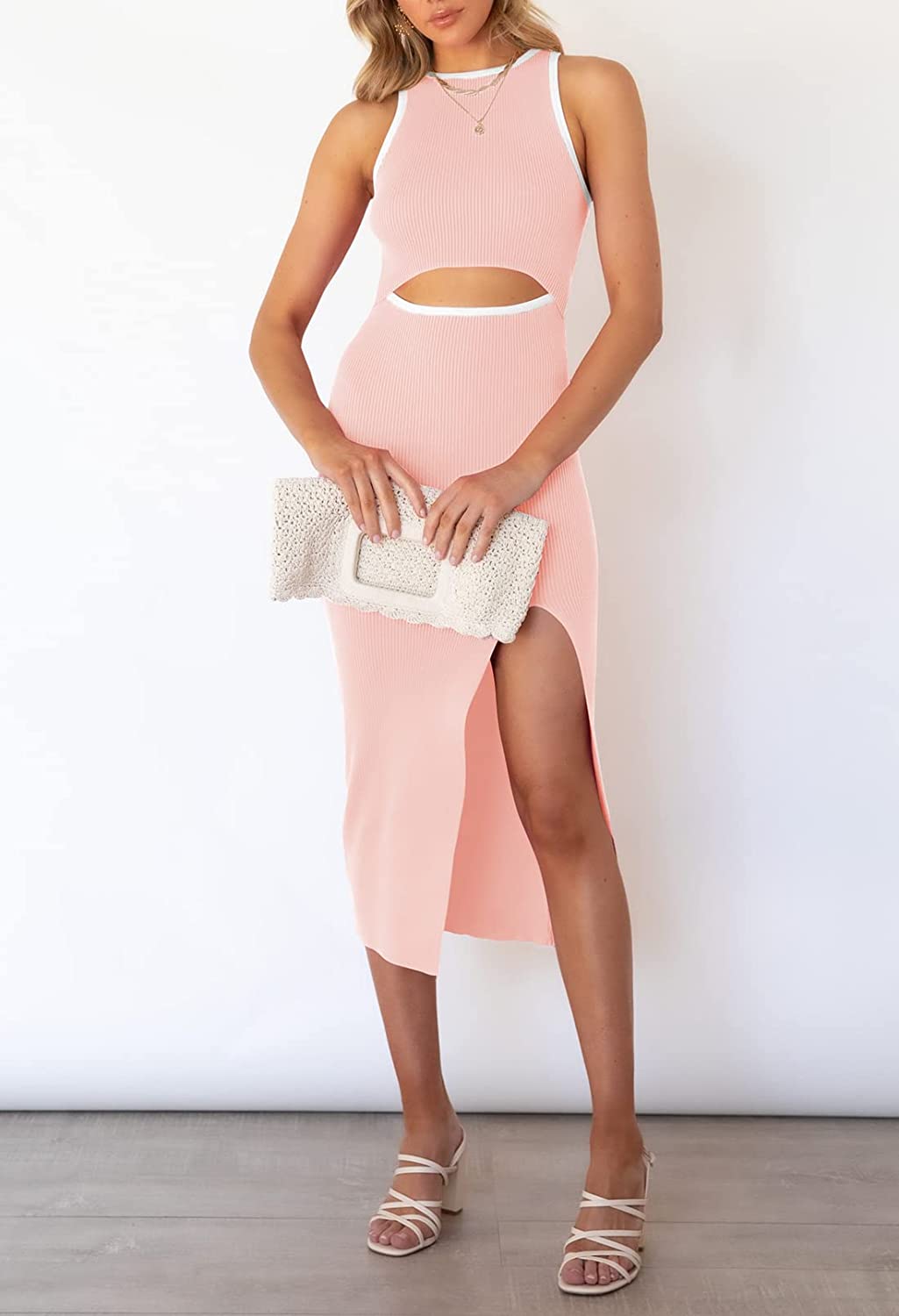 Sleeveless cutout bodycon dress, solid color and color block, hollow out, slim fit, tank knit midi cocktail dress