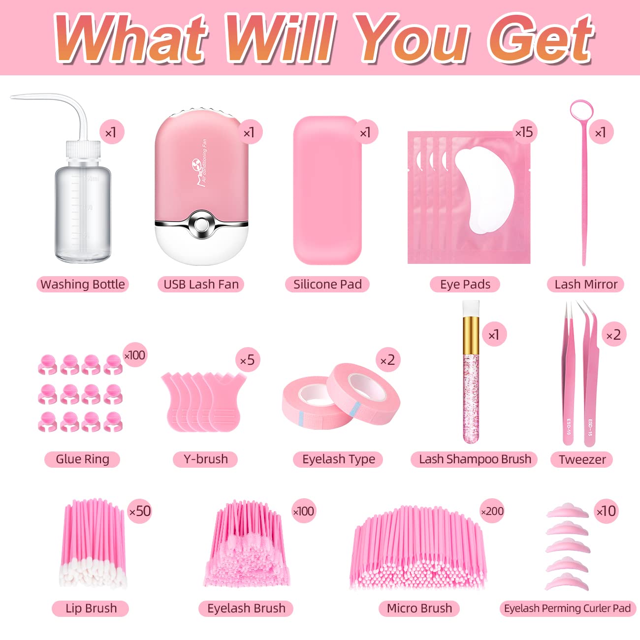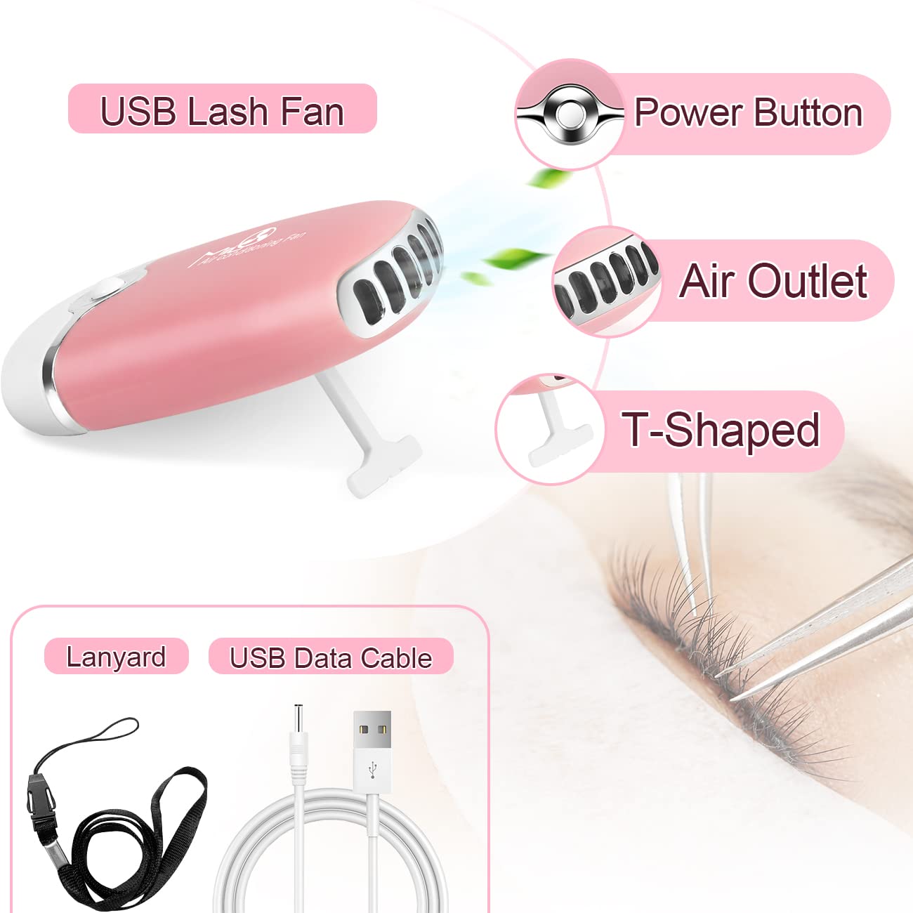 【Package Included】 487 pieces lash extension kit includes 1PC of USB mini rechargeable eyelash air conditioning fan with data cable and lanyard, 1PC of washing bottle, 1PC of silicone pad, 15PCS of eye pads, 1PC of lash mirror, 100PCS of glue ring, 5PCS of Y-brush, 2PCS of eyelash type, 1PCS of lash shampoo brushes, 2PCS of tweezer, 50PCS of lip brush, 100PCS of eyelash brush, 200PCS of micro brush, 10PCS of silicone eyelash perming curler pad.