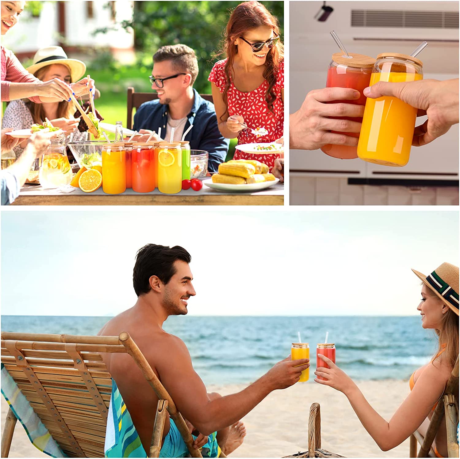 Naeety Glass Cups with Bamboo Lids and Glass Straw, Drinking Glasses Set of 4-16 Oz Beer Can Shaped Glass Cups, Iced Coffee Glasses, Tumbler Cup for Smoothie, Cocktail, Whiskey - 3 Cleaning Brushes