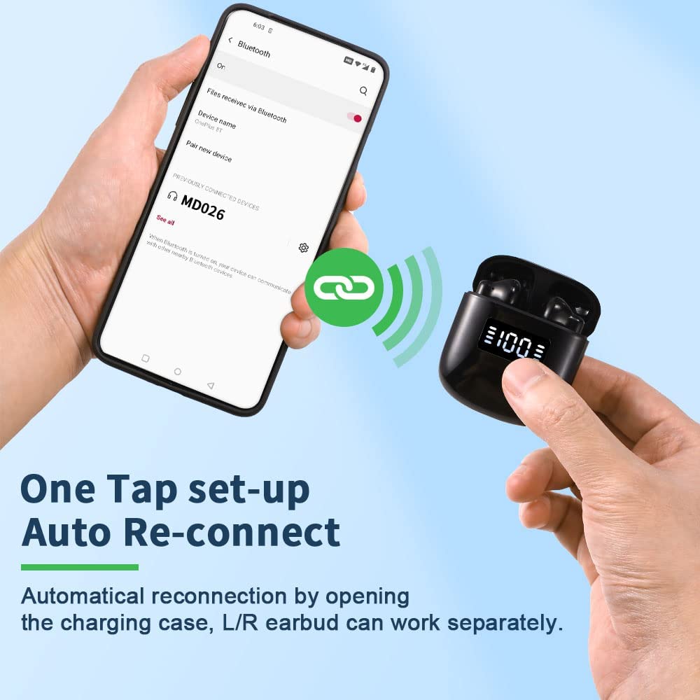 - Hall Switch and Automatic Pairing: Bluetooth earphones adopts hall switch. Open the lid of the charging case and the earphones will automatically pair and reconnect to the most recently connected Bluetooth device. After placing the earphones in the charging case, the lid of the charging case needs to be closed to disconnect the bluetooth connection and allow the earphones to charge. No matter the left/right earbud could connect to the device independently.