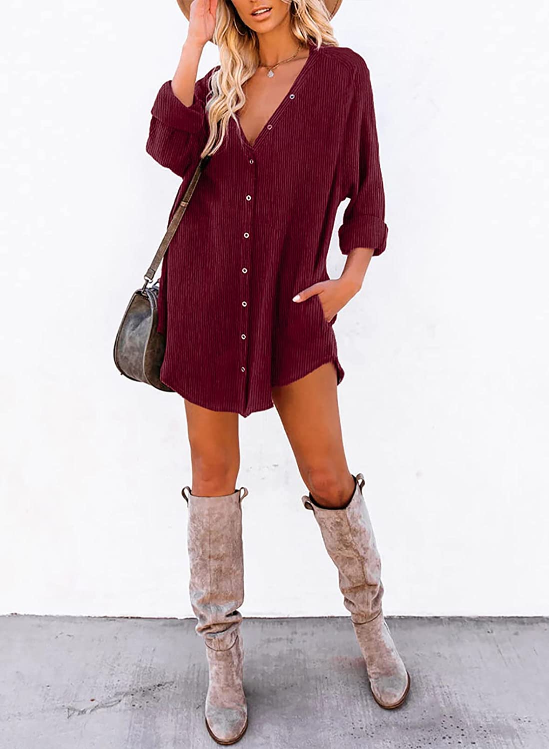 Fashion Design: Long Sleeve, Button, V Neck, Solid Color, Oversized Corduroy Shirt Dress.