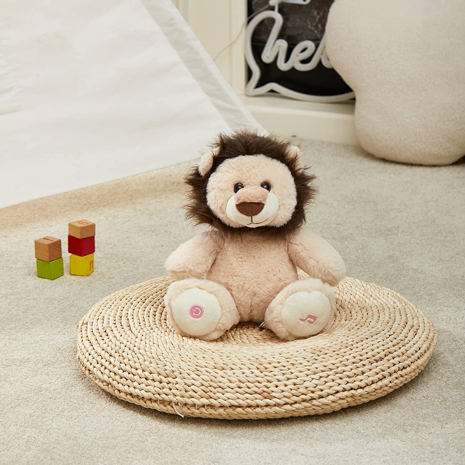 10 LULLABIES INSIDE-There are 10 nursery songs inside the lion stuffed animal: Mary Had a Little Lamb, Rain Rain Go Away, Twinkle Twinkle Little Star, Five Little Monkeys, Hickory Dickory Dock, The Wheels on the Bus, Do Re Mi, Fishing Fishing, If You are Happy and You Know It. All of the sings are sung by clear voice, your kids can learn to sing with the lovely friend. Play with the lion during the day and at night.