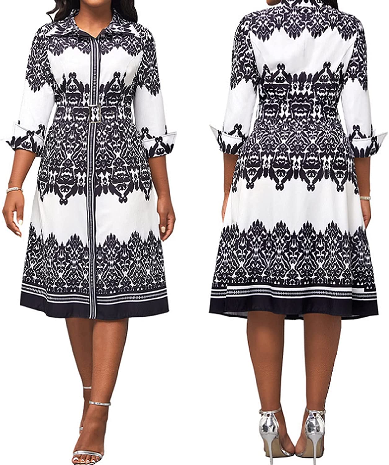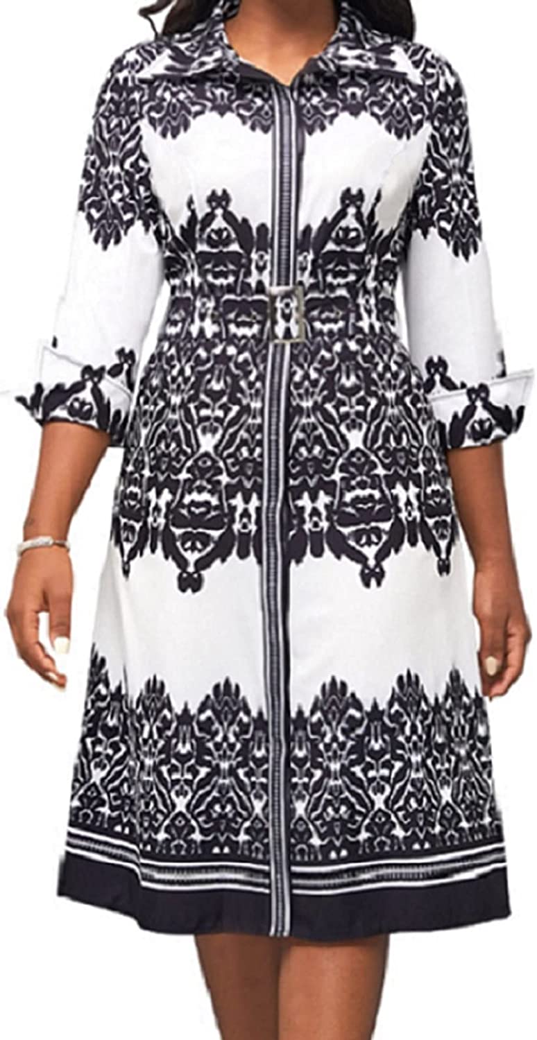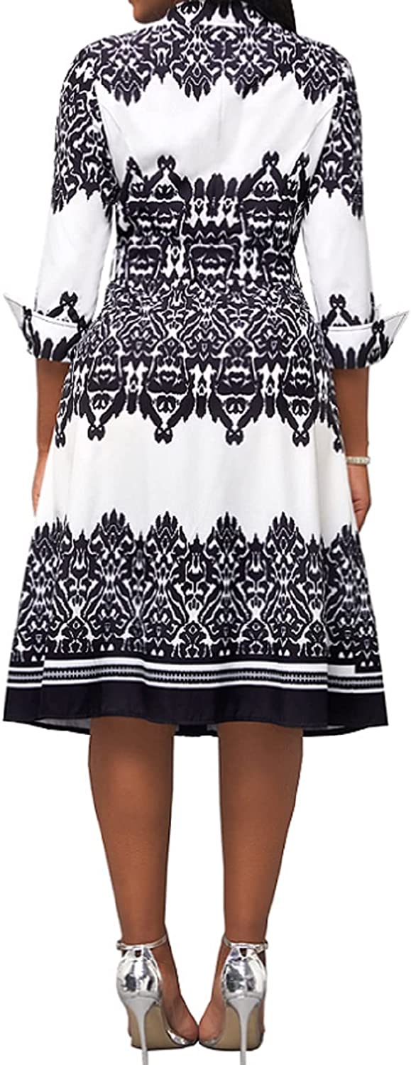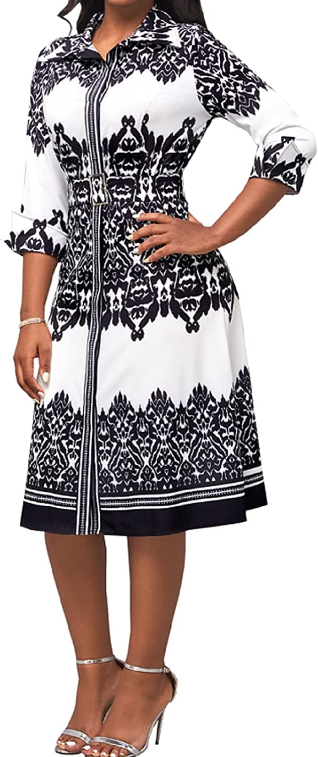 Women Button Down Dress features v neck,shirt collar,3/4 Sleeve,with Belt,printed midi pencil dress.