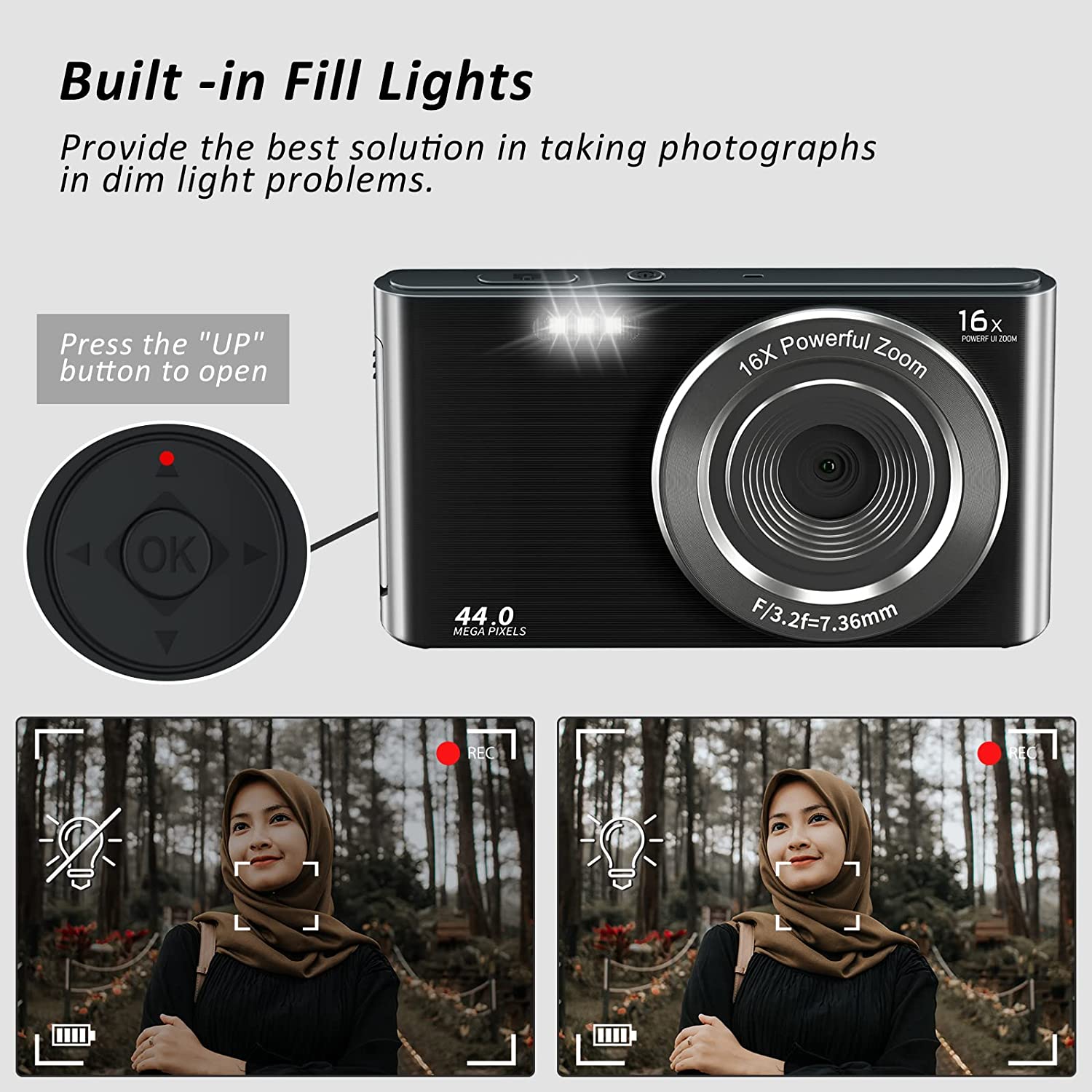 - 【4K & 44MP Digital Camera for Photography】NIKICAM 4k compact photography camera for kids girls boys adults has 4k video resolution and 44MP image resolution, and support 16X digital zoom, helping you capture and record the most exciting memorable moments with high-quality images or videos. This rechargeable digital camera come with a 32GB SD card, just turn the camera on and record the exciting moments wiht your family now!