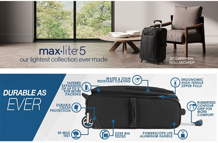 Roll onboard with lighter luggage that doesn't sacrifice durability for performance; The Maxlite 5 22" Expandable Rollaboard gives you domestic carry-on convenience in a roomy all-in-one suitcase. Packing is easy and organized with two quick-access, exterior front pockets, full-length interior lid pocket, side accessory pocket and adjustable hold-down straps. Maximize your packing power with a high-tensile-strength expandable zipper that adds up to 2" more capacity, while the 2-position adjustable PowerScope Lite handle and high-performance ball bearing wheels ensure a turbulent-free glide. This Fit to Fly carry-on rollaboard has been sizer been tested to accommodate overhead bin space on most major US airlines. Fully expanded Carry-On may not meet airline restrictions. Backed by Travelpro's Limited Lifetime Coverage plus a new and expanded "Trusted Companion Promise", which covers the cost of repair for damage from airline or other common carrier for 1 year. Also, with our new Trusted Companion Promise, we will even reimburse shipping costs when you send your bag to us for warranty repair or replacement during that 1st year.