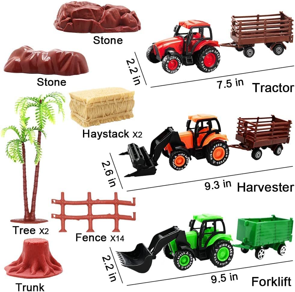 ?? FARM PLAYSET: Playset with 3 Transport Farm Tractor, 14 farm figurines, 14 fence, 2 bales of hay, 2 tree, 2 stones, 1 tree trunk and 1 storage case, your children can spend long hours exploring and building the farm animals world.