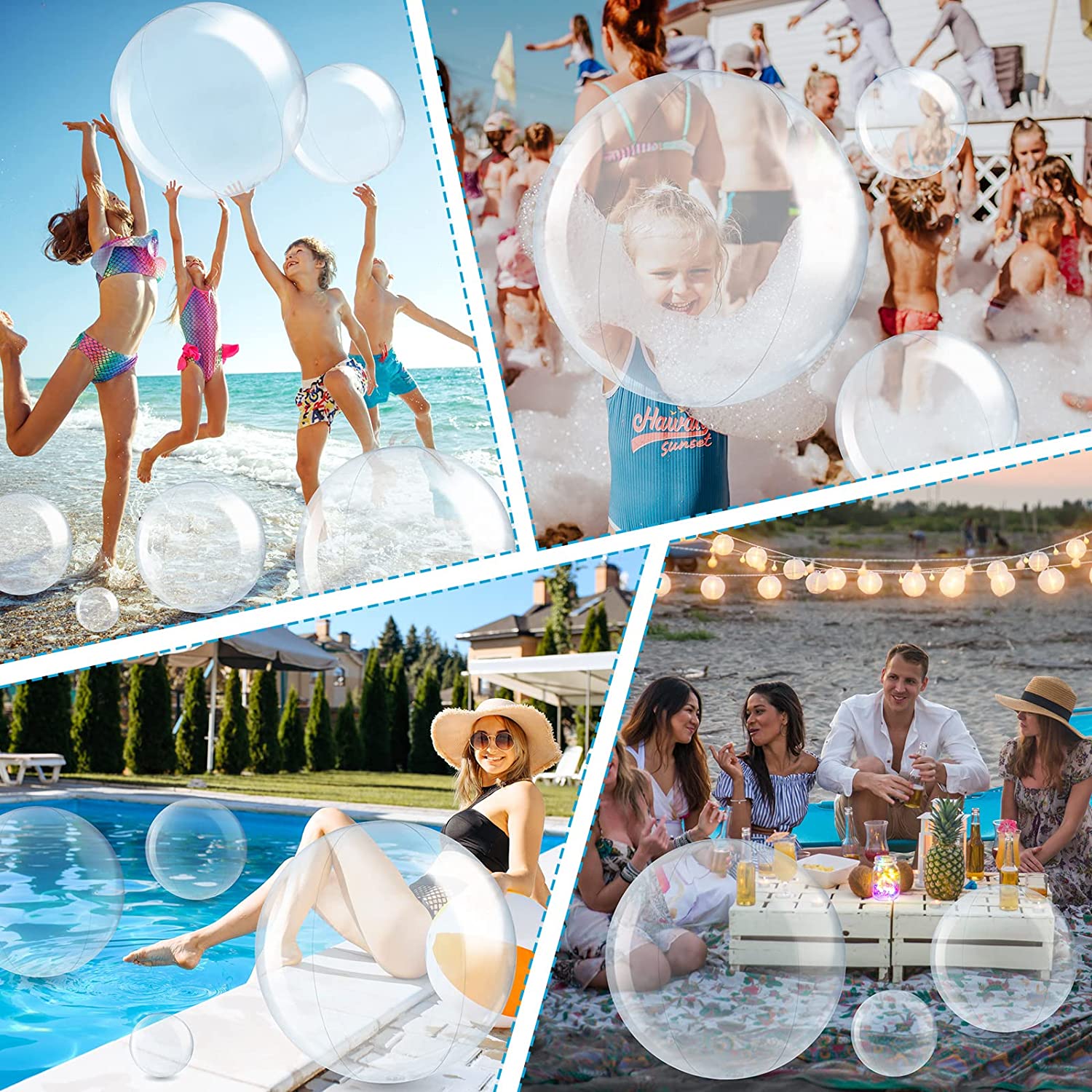 Clear Beach Balls: the inflatable beach balls are clear design, which is beautiful and attractive especially under the sun or spotlight, easy to catch most boys and girls' attention and cater to their tastes
