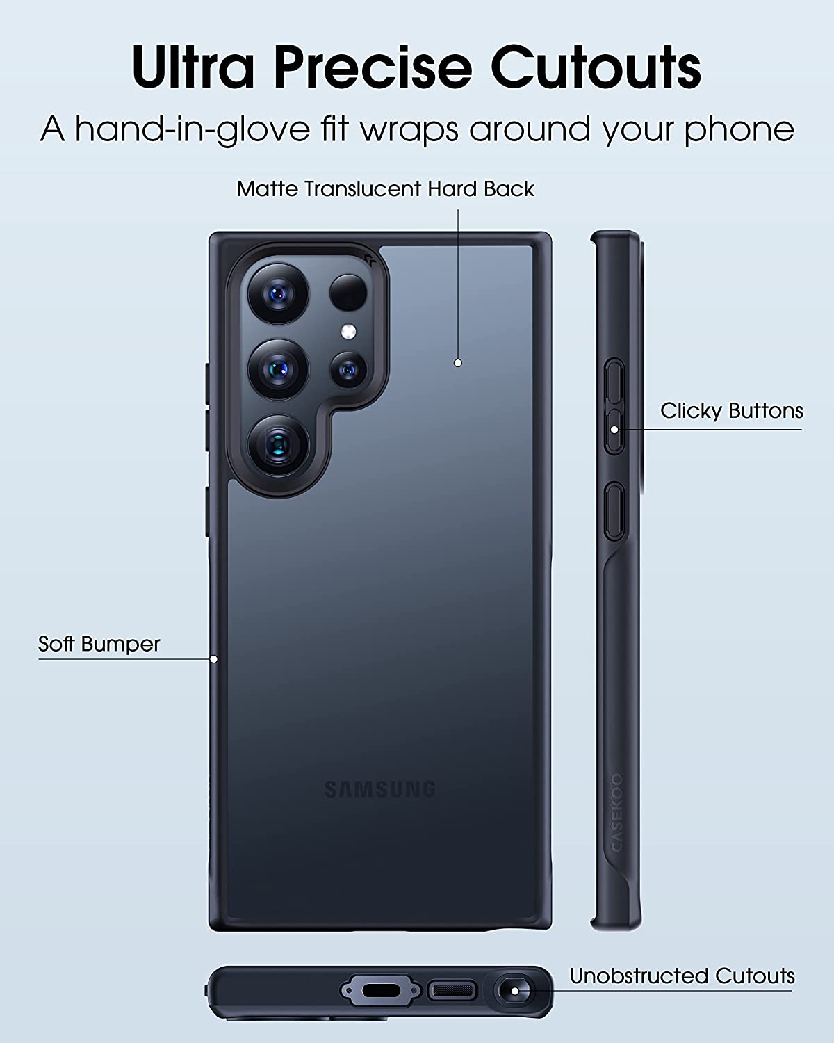 - 【Zero Smudge, Lasting New】Thanks to the zero-smudge matte hard backplane, it is sturdy, scratch-resistant and it stop 100% of fingerprints, oil & lint from sticking to your Samsung S23 Ultra case while providing a silky matte touch feeling.
