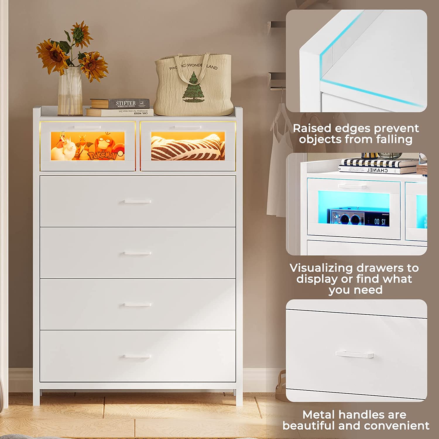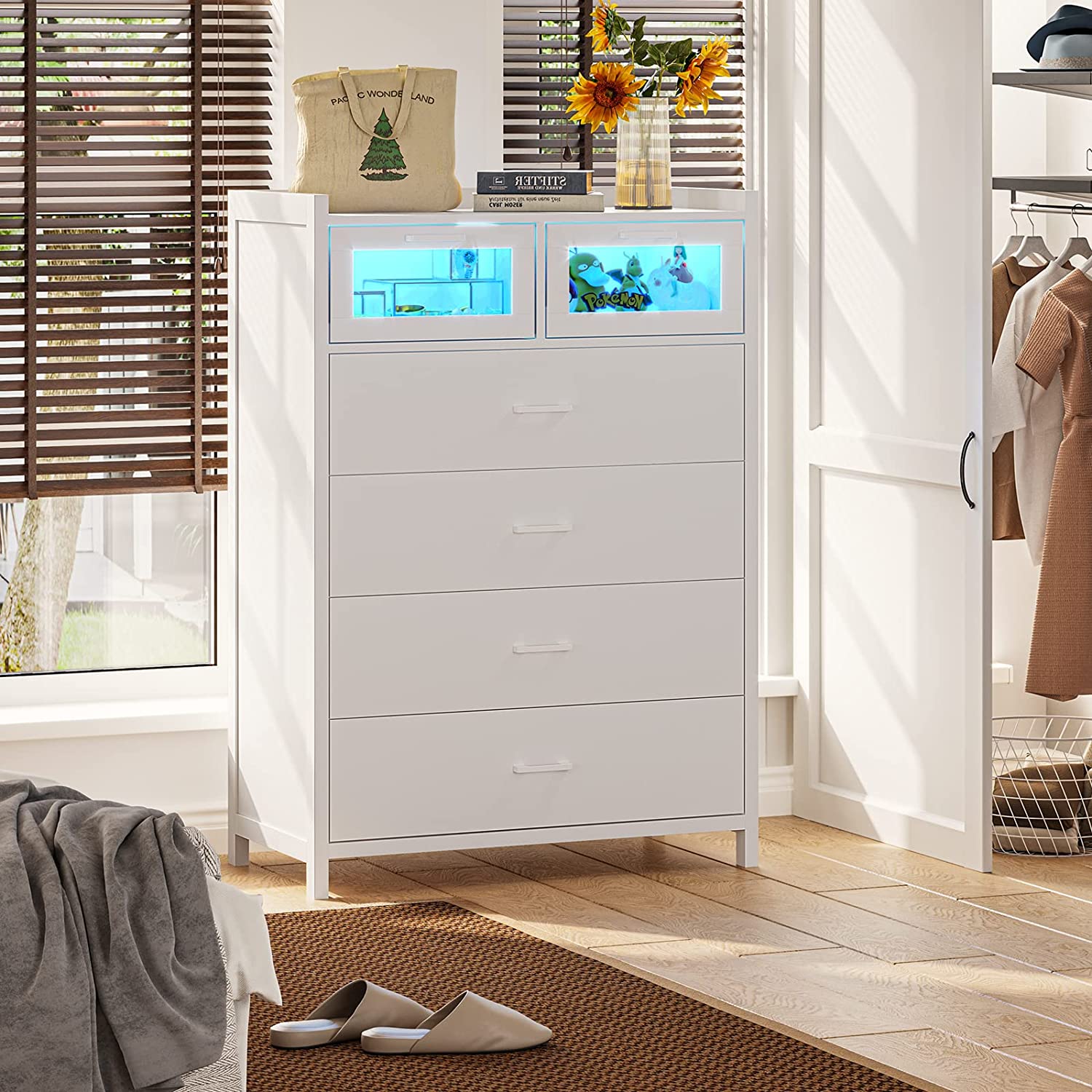 【Unique Visualizing Drawer Design】VIAGDO white dresser has 6 large drawers. The top visualizing drawer combines elements of wood and glass to not only display what you like, but also insulate dust for cleaner and more convenient; Equipped with colorful LED light strips add a soft and warm atmosphere to the bedroom dresser. Make the bedroom dresser more unique and attractive.