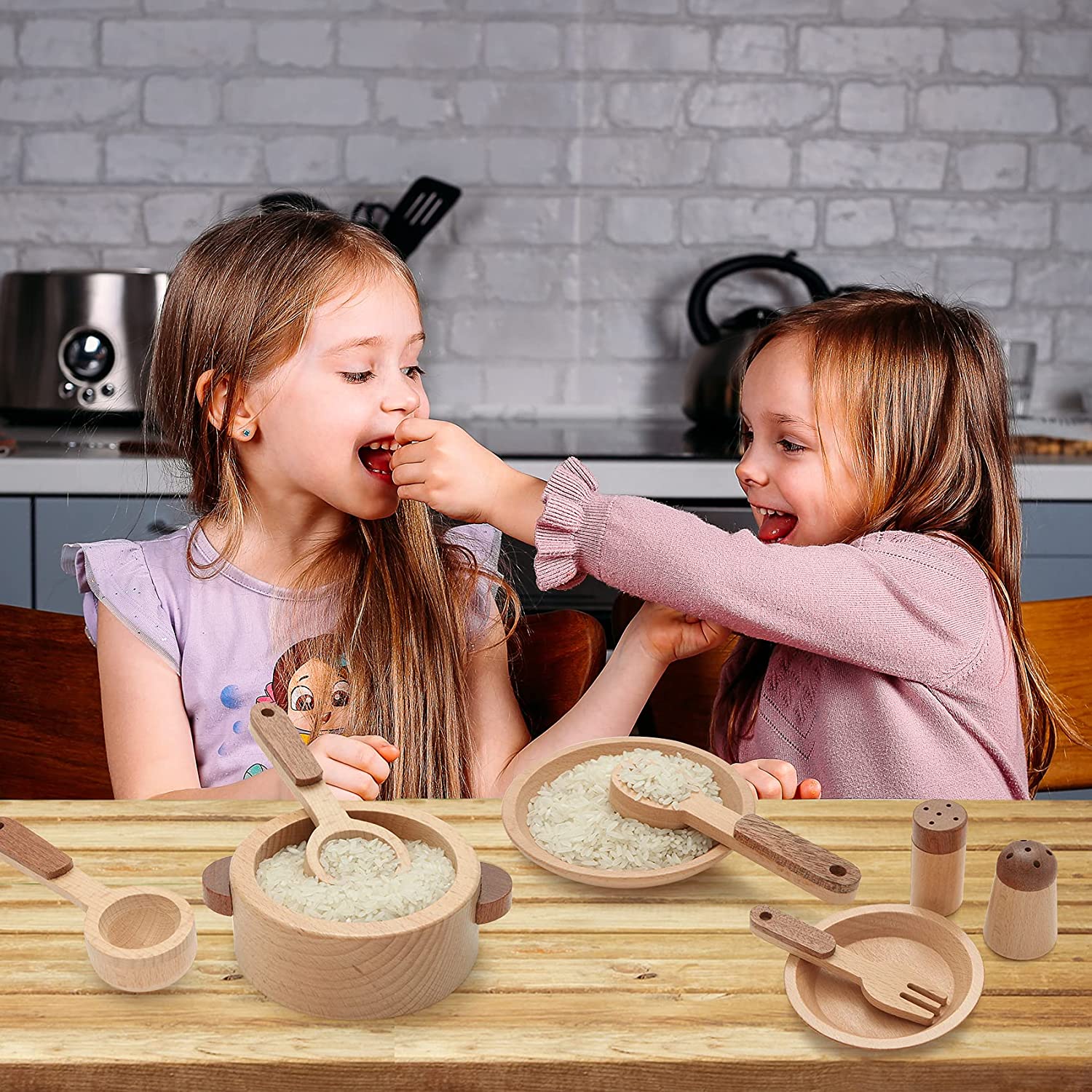 - 【14 Pieces & Easily Carry】: The toddler kitchen playset comes with 14 pieces, including cooker pot, frying pan, spices, slotted spatula, ladles, plates and forks, which can properly fit babies' wooden kitchen toys. With a storage bag, the wooden play kitchen toys can be easily preserved after playing and suitable for outdoor activities.