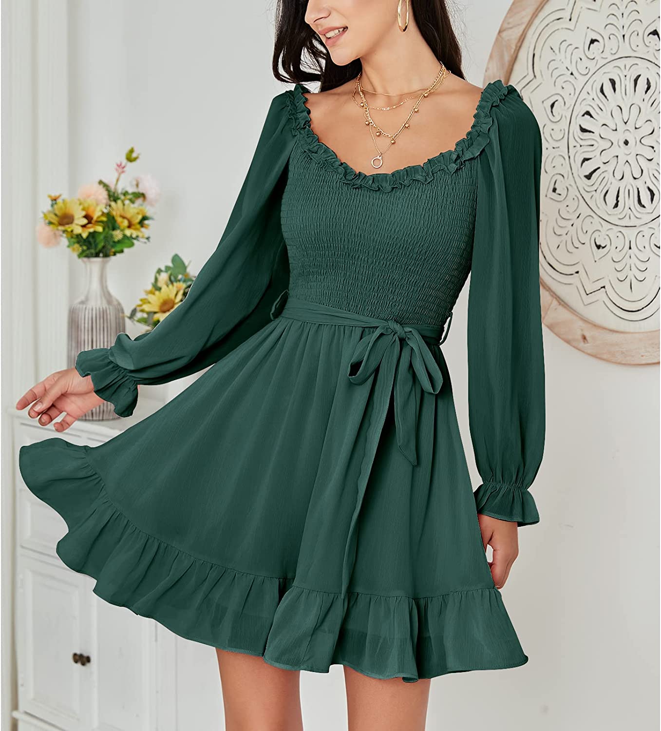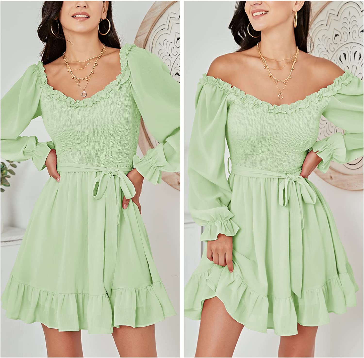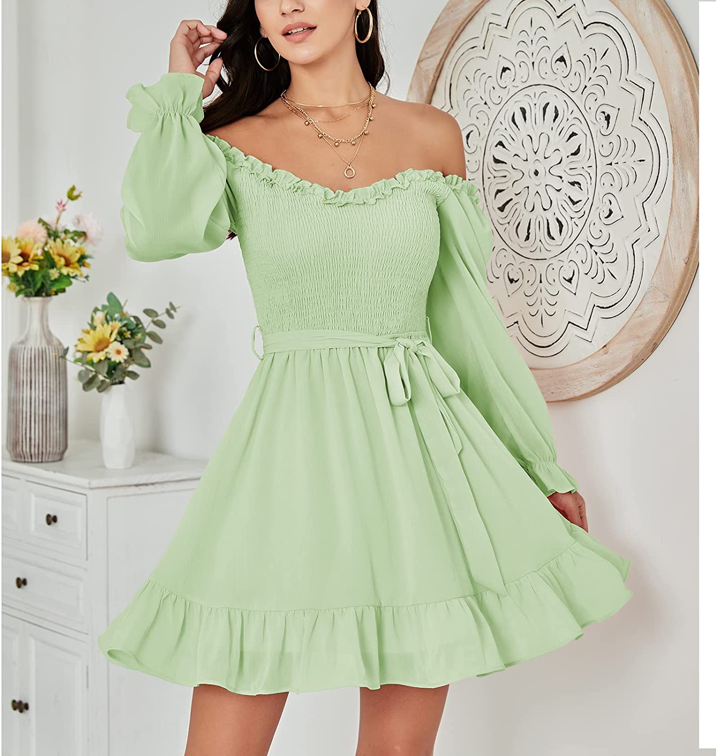 Feature: long sleeve, ruffle V-neck, off-the-shoulder, smocked bodice, mini dress, waist tie, flowy swing skirt, hight wasit,ruffle hem, prefect for teens wear,go toanywhere like cocktail, party, date night in spring.