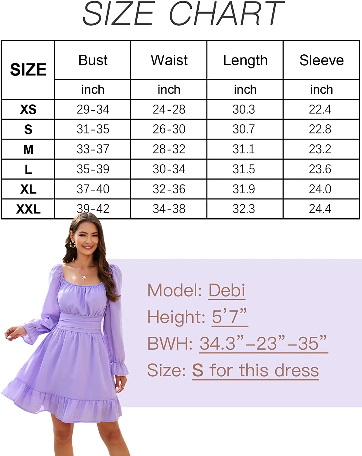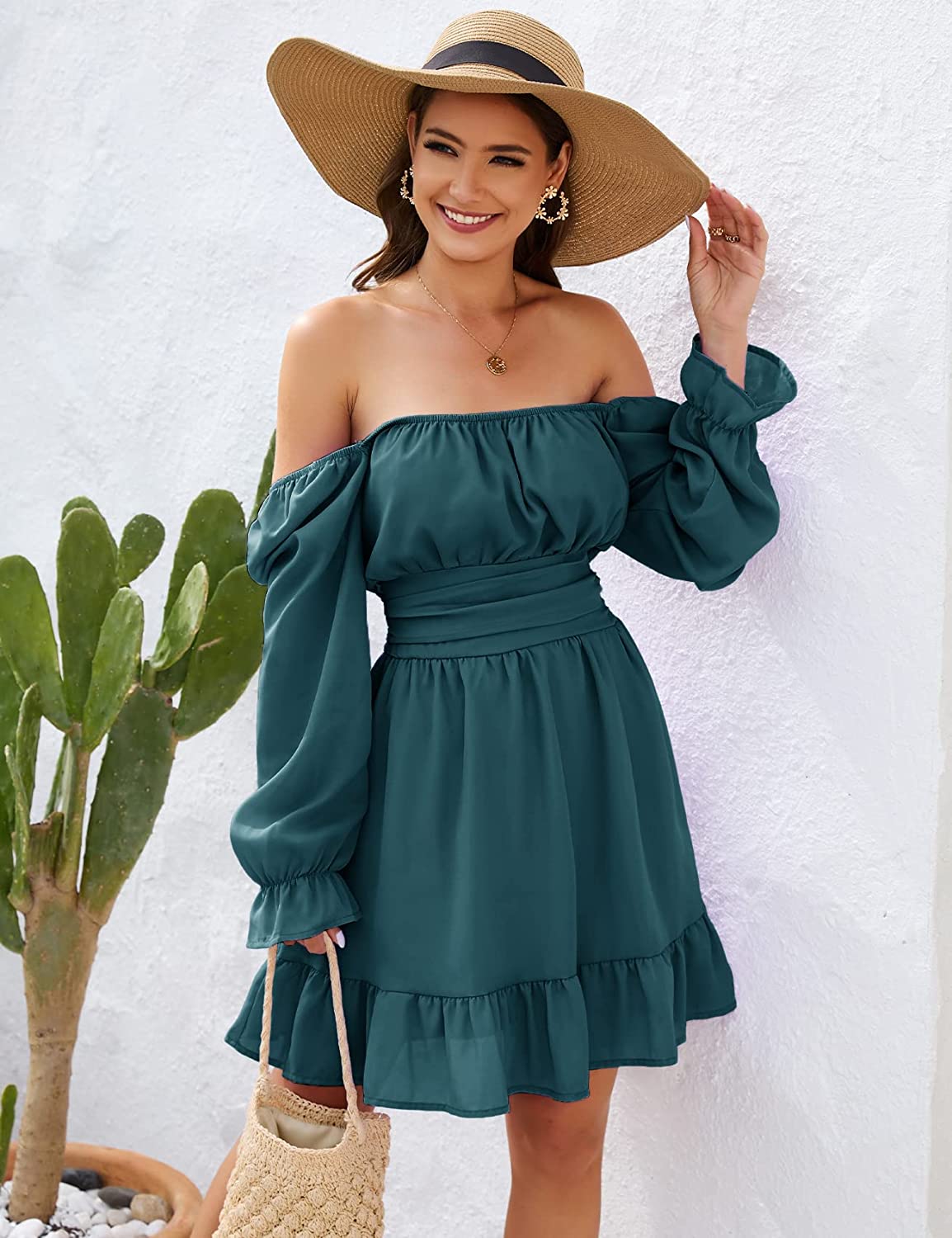 Features: Square neck, long lantern sleeves, ruffle elastic waist, back tie bow, mini length, slim fit, A-line swing dress, off shoulder if you like.