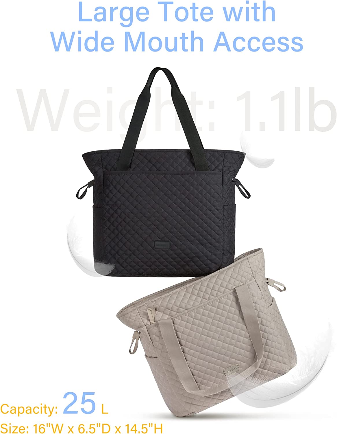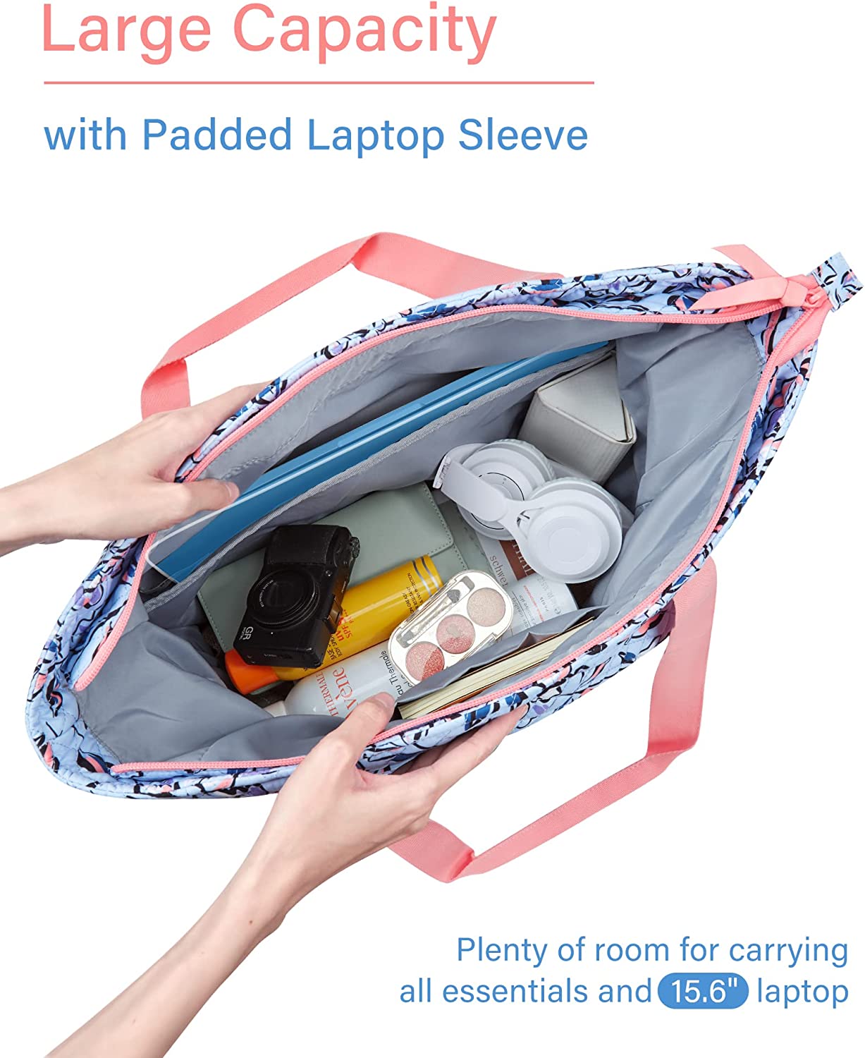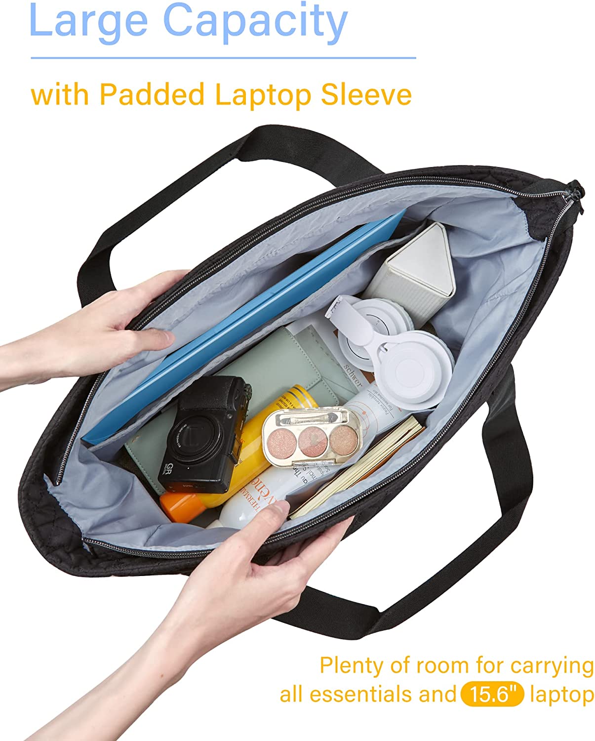 • Fits All Your Essentials: The tote bag offers a spacious interior for carrying all your essentials. It's 16" wide and 14.5" tall with a 15.6" padded laptop sleeve and features durable top handles that provide a convenient carrying option