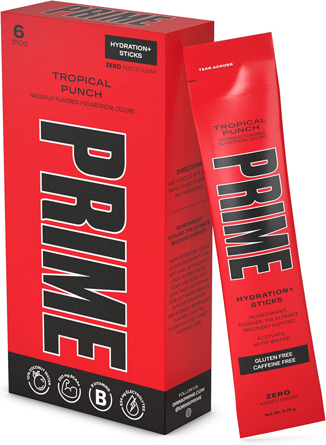 Prime Hydration+ Sticks are only 20 calories per serving with zero added sugar, 250mg BCAA, 834mg electrolytes, B vitamins, antioxidants, and 10% coconut water