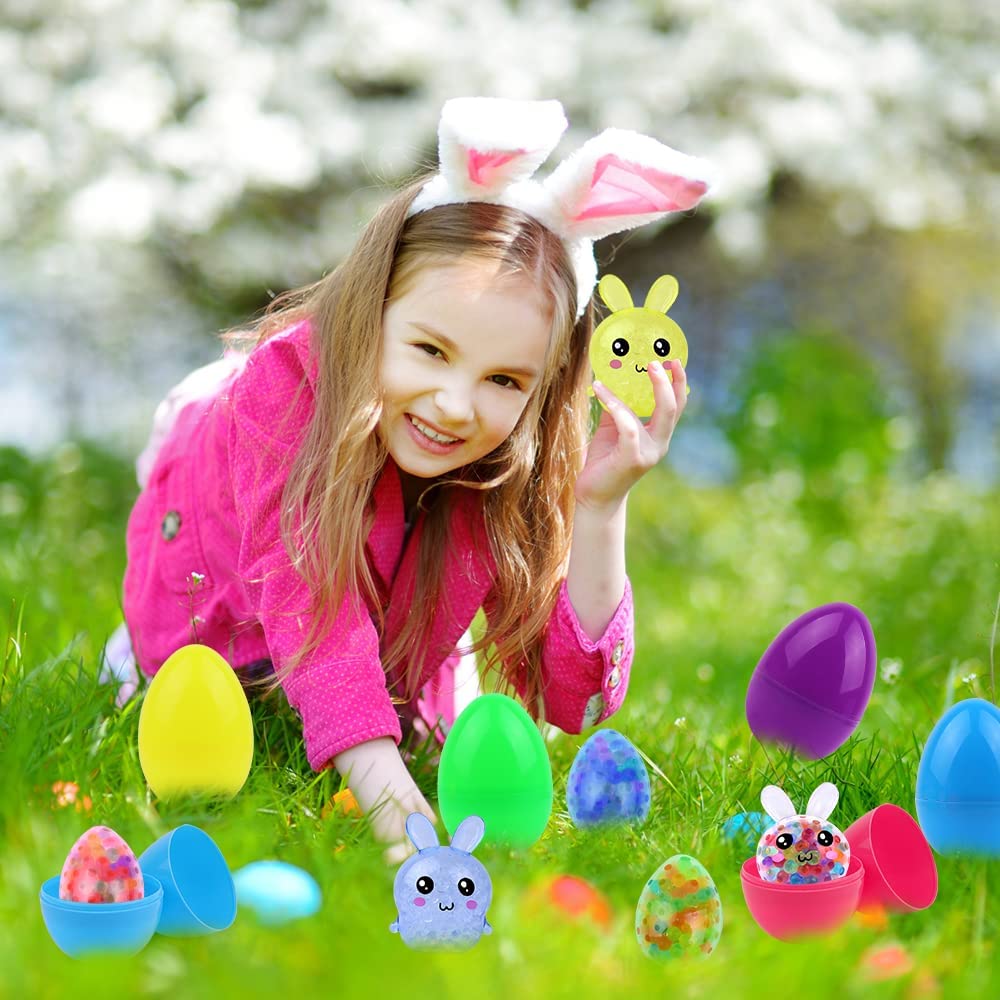 【Easter Fidget Toy Pack】 Package includes 6pcs plastic Easter eggs with Easter stress ball toys inside(3pcs Bunnies, 3pcs Eggs), soft and cute, perfect for kids and adults to relieve stress. 6pcs Easter fidget toy are perfectly hidden in the egg and will surprise your children! Colorful Easter eggs are more visible, easy to find for kids on Easter egg hunting games.