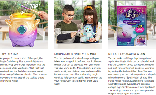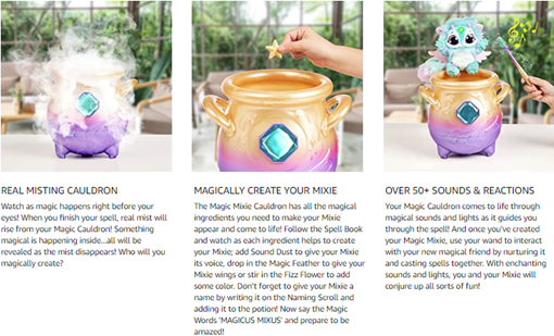 Experience Real Magic With The Magic Mixies Magic Cauldron. You Will Be Amazed When You See What Magically Appears From The Mist When You Finish Casting Your Spell! Who Will You Magically Create? Your Magic Mixies Magic Cauldron Comes With All The Magic Ingredients And A Special Wand For You To Mix A Potion And Make A Cute Furry Pet! First Read The Spell From Your Spell Book. Add The Magical Ingredients To Your Cauldron One Step At A Time. Each Ingredient Helps Your Creature Come To Life. As You Go Through Each Step Of The Spell And Tap The Cauldron With Your Wand, Your Cauldron Will React By Lighting Up And Making Different Sounds. Now Watch As Real Mist Begins To Rise From The Cauldron. Listen! Do You Hear Your Magic Mixie Coming To Life? Wow, You'Ve Just Created A Magical New Friend! So Adorable And So Interactive, Your Magic Mixie Reacts To You Touch And Responds To Your Wand. They Love To Perform Spells With You And May Even Grant You A Wish As Their Gem Lights Up! Magic Mixie Love Cuddles And Being Pet. The More You Nurture And Care For Them, The Stronger Their Energy Levels Become. Your Magic Mixie And Their Magic Cauldron Have Over 50 Sounds And Reactions! Place Your Magic Mixie Back Into The Cauldron And Repeat The Magical Reveal Again And Again. (Magic Mist & Spells Refill Pack Sold Separately) You Can Also Make Your Own Toys And Other Items Magically Appear From The Mist Using The Cauldron'S Magic Gem Case. Perform Spells And Misty Reveals And Amaze Your Friends! With Two Different Colored Magic Mixies To Choose From - Pink Or Blue, There Is So Much Enchantment In Store And Adorable Magical Friends To Adore!