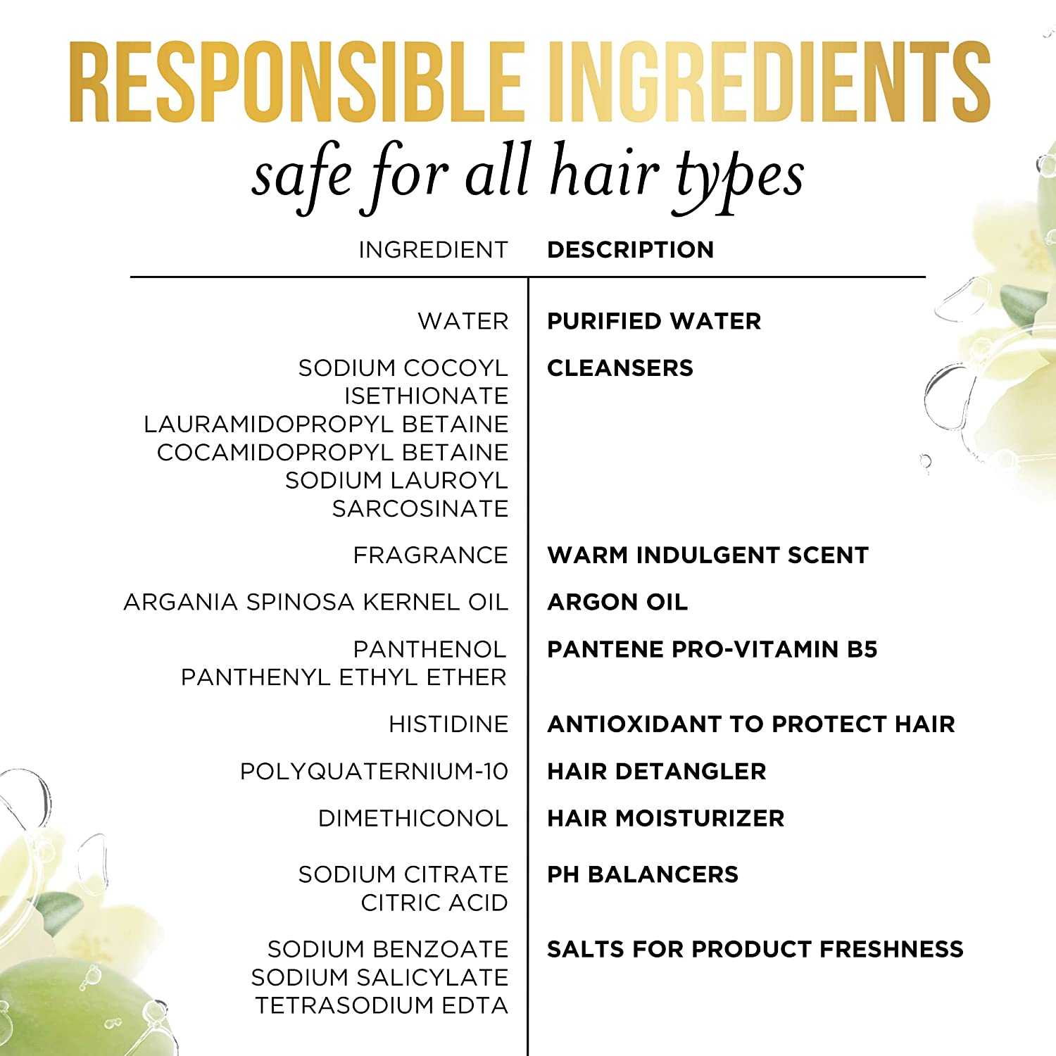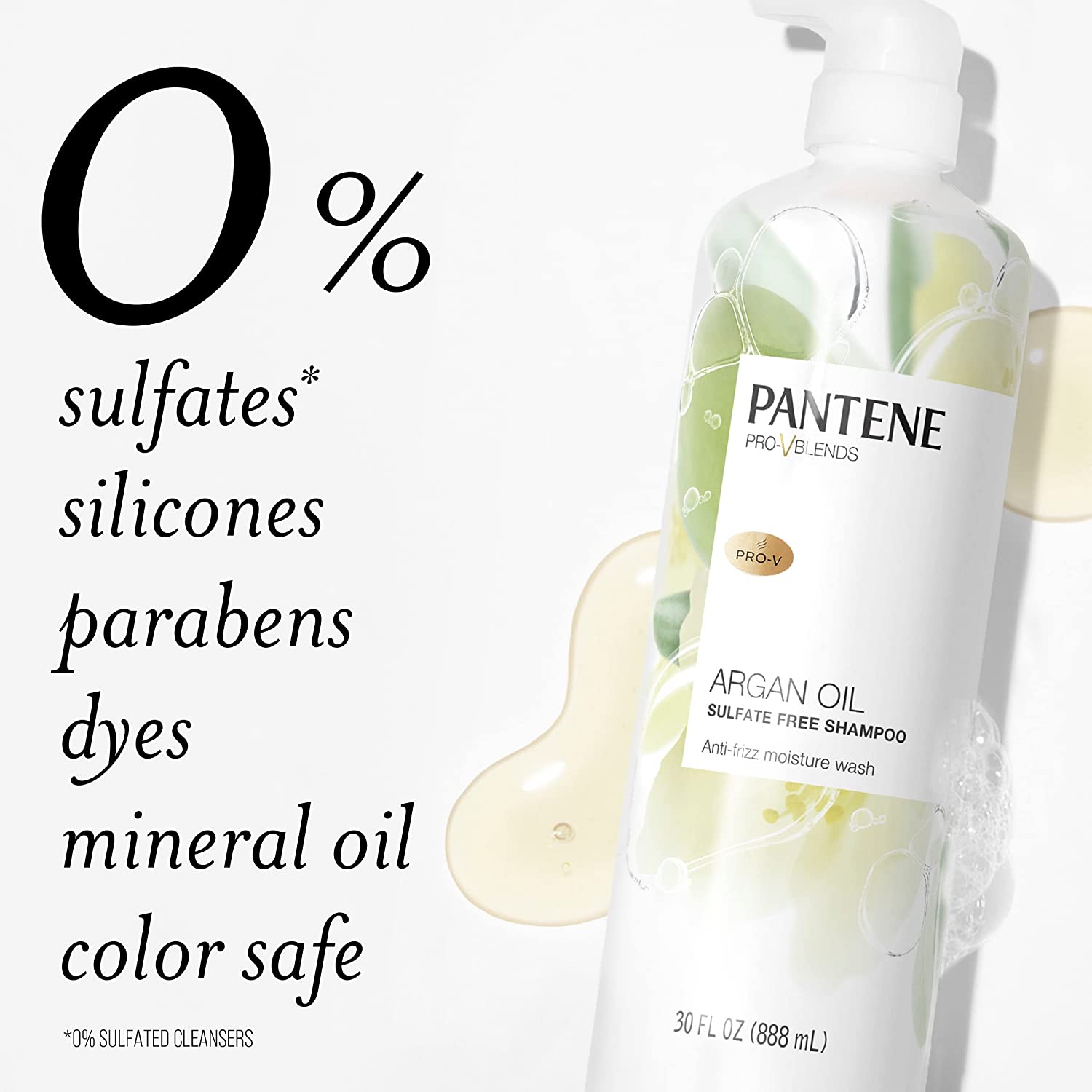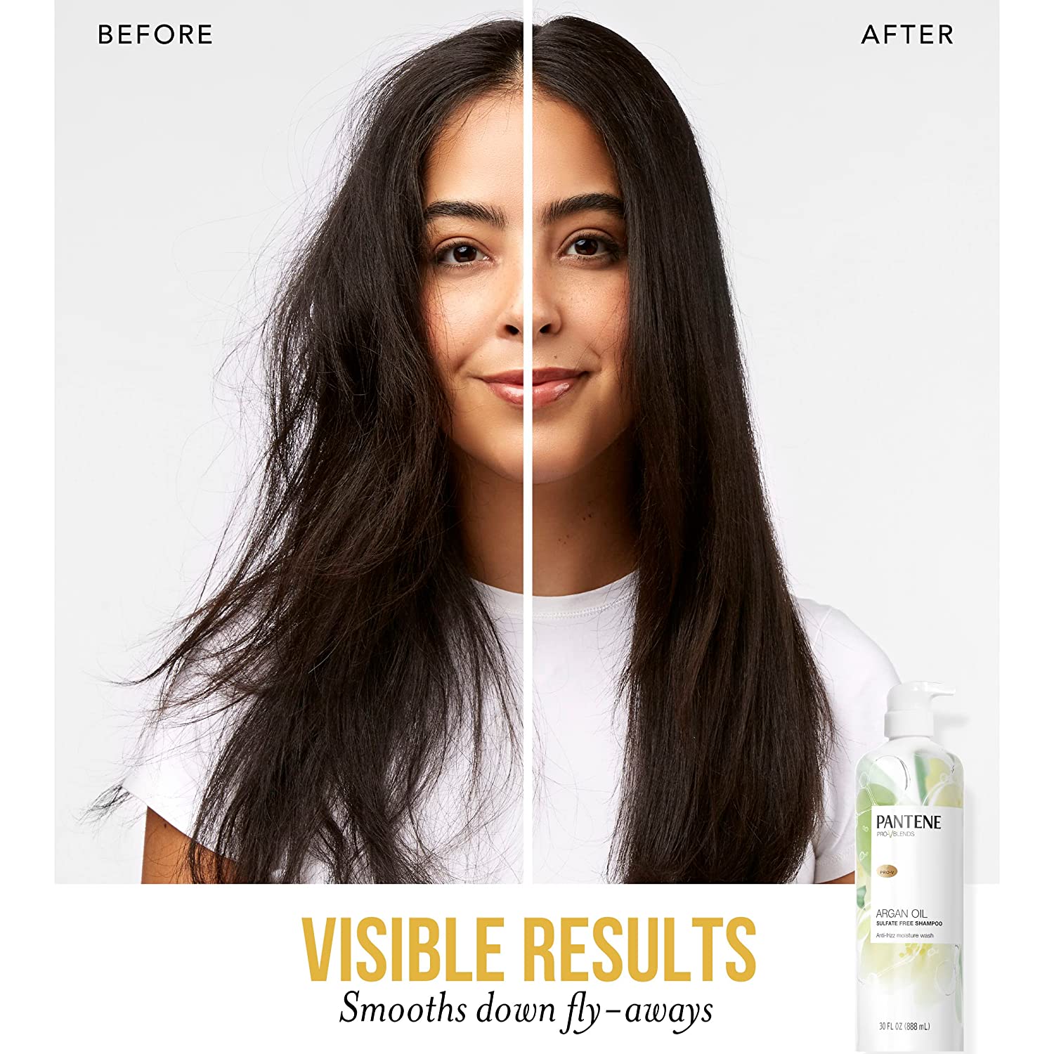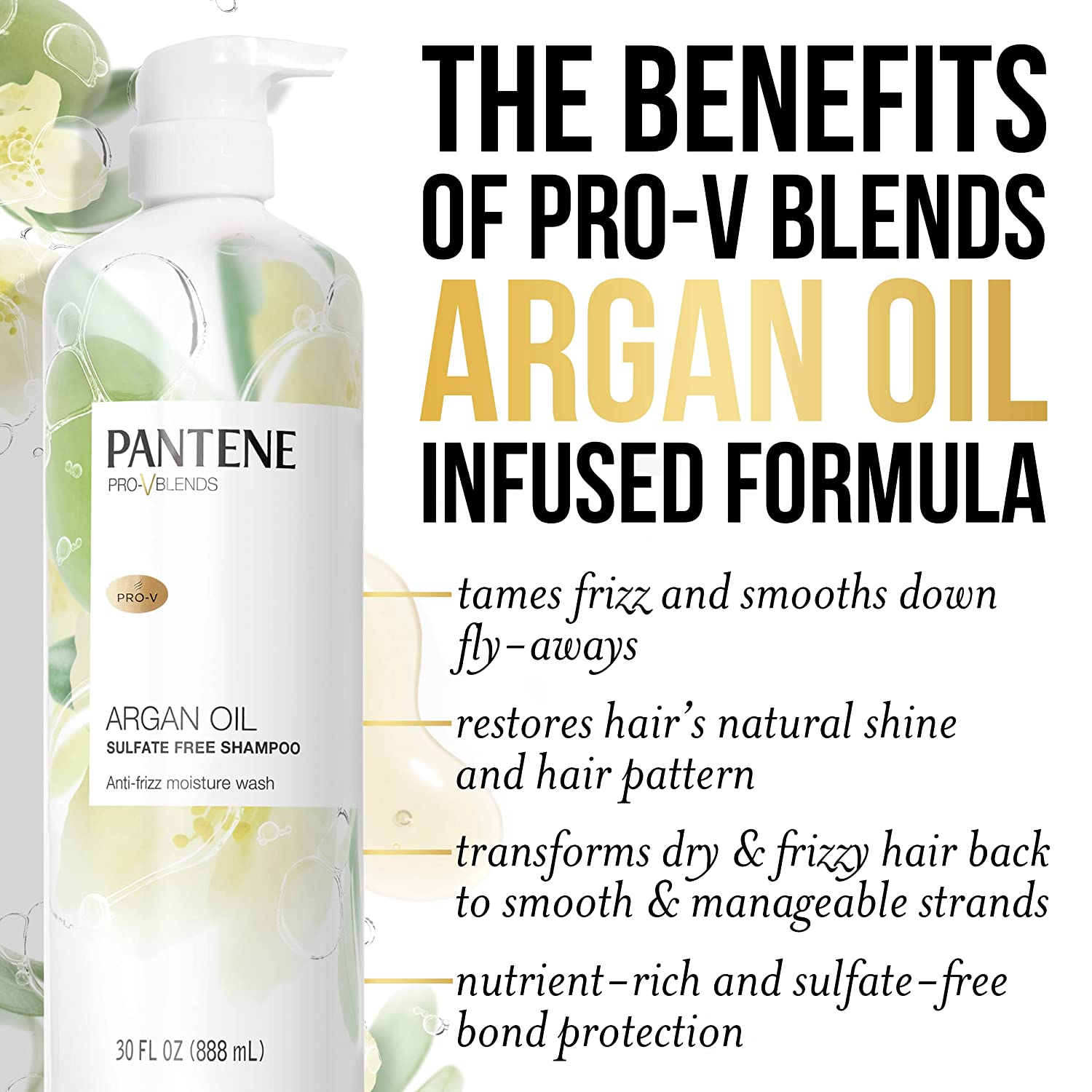 Seeking a nutrient-infused, sulfate-free shampoo for dry, frizz hair? Pantene Pro-V Blends Argan Oil Shampoo is a sulfate-free moisture wash crafted with a blend of argan oil, Vitamin B5 and antioxidants to tame frizz, smooth down fly-aways, and restore your hair's natural shine and hair pattern. This anti-frizz formula provides nutrient-rich sulfate free bond protection and transforms dry and frizzy hair back to hydrated, flowy locks. Every time you step into the shower, enjoy smooth, hydrated hair with the help of this sulfate-free Argan Oil infused shampoo. The Pantene Pro-V Blends Argan Oil Collection has been developed to bring out the best of your hair, with nutrient-rich ingredients free from sulfates, silicones, parabens, dyes, and mineral oil. HOW TO USE Massage Pantene Pro-V Blends Argan Oil Shampoo into your wet hair. Make sure to pay special attention to your scalp for the best cleanse. Rinse thoroughly. For best results, follow with Pantene Pro-V Blends Argan Oil Conditioner for extra nourishment. Wash the conditioner completely out of your hair. Dry and style your hair as you would normally. We strive to bring you innovative formulas using proven ingredients, so that every product we make helps you face the world with confidence. Transform the hair you have to the hair you want for more great hair days