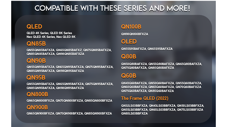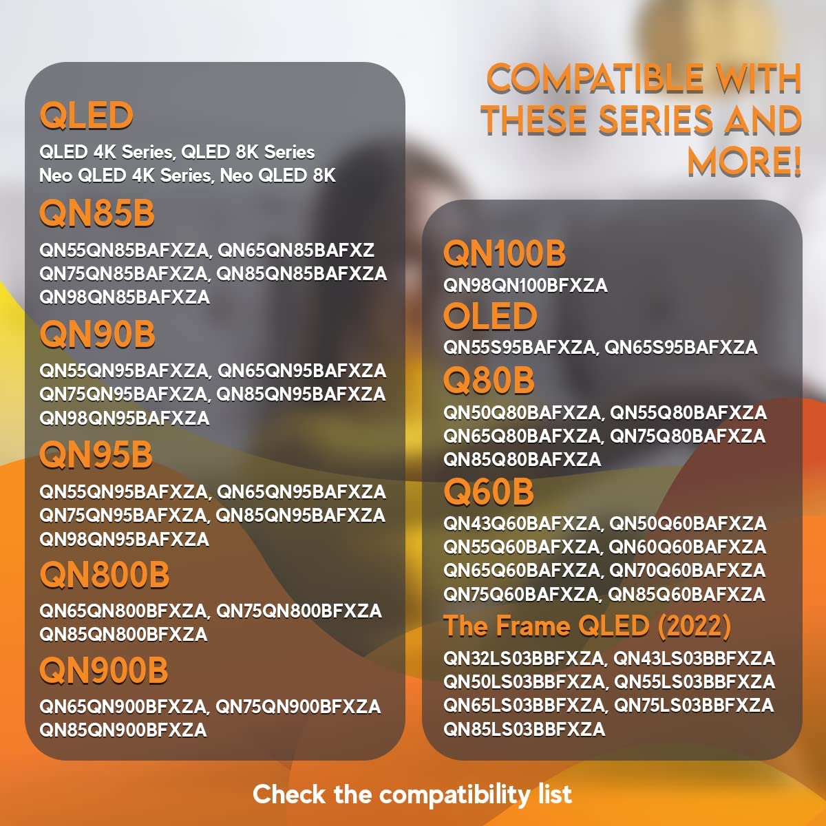 - Compatible with QN55QN85B, QN65QN85B, QN75QN85B, QN85QN85B, QN98QN85B, QN43QN90B, QN50QN90B, QN55QN90B, QN65QN90B, QN75QN90B, QN85QN90B, QN98QN90B, QN55QN95B, QN65QN95B, QN75QN95B, QN85QN95B, QN98QN95B, QN65QN800B, QN75QN800B, QN85QN800B, QN65QN900B, QN75QN900B, QN85QN900B, QN98QN100B