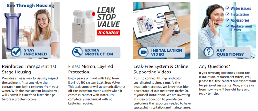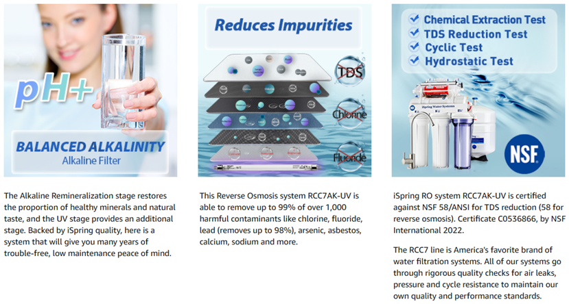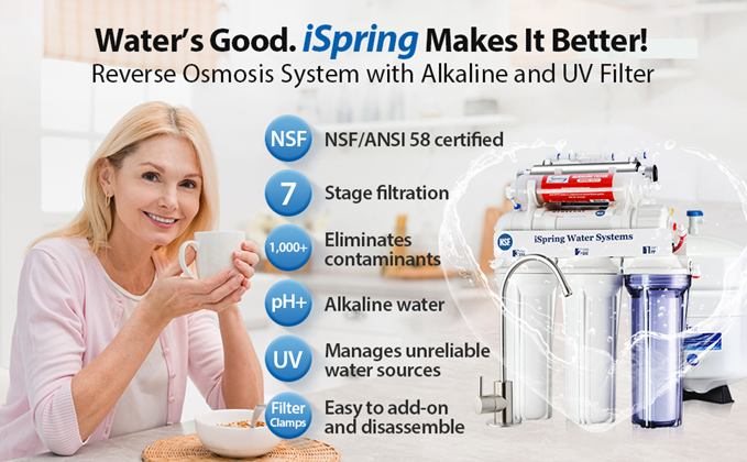 The RCC7AK-UV Reverse Osmosis system under sink consists of 7-stage, layered filtration built around reverse osmosis (RO) technology that removes over 1000+ different kinds of contaminants. The combination of both GAC and CTO filters in the 2nd and 3rd stages provides more protection against harmful chemicals than CTO alone. This iSpring water filter system features a 75 gallon-per-day capacity RO membrane, it can handle the drinking water needs of even a large family.