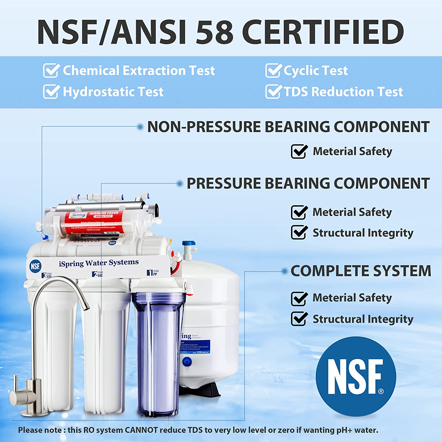 - Certified to NSF/ANSI 58, this Reverse Osmosis under sink mounted water filter and Point-of-use water softener contains 7 different stages of filtration to remove up to 99% of over 1,000 contaminants, including lead (removes up to 98% of lead), chlorine, fluoride, arsenic, asbestos, calcium, and sodium and more.