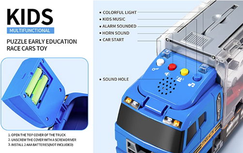 - ENRICH EARLY EDUCATION KNOWLEDGE - Our upgraded version of the race cars toy has a good early education function. Through the 4 buttons on the front of the truck, your child will see cool lights, hear the sound of the vehicle starting, the sound of the horn, the realistic police sound and the pleasant music. It is very suitable for parent-child education and cultivate children's imagination and creativity. There is a need for 2 AAA batteries (not included).