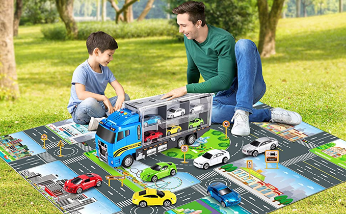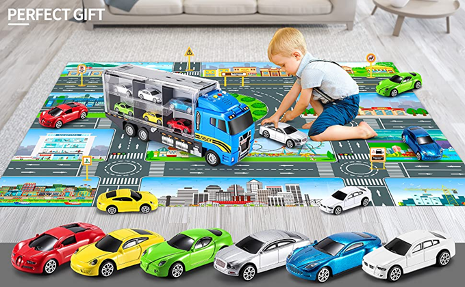 - KIDS RACE CAR TOYS SET - Equipped with 1 x foldable play mat, 1 x multi-function transport cars, 6 x different colorful die cast race cars and a set of road signs. It is highly recommended for kids aged 3 and above to create endless happy times!