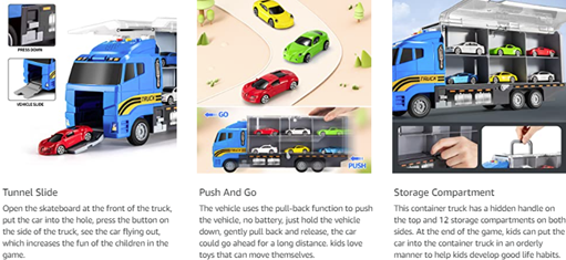 Our multifunctional racing-themed toy truck has the function of early childhood education. Very suitable for parent-child educational toys. Through 6 small cars of different colors and a large truck with storage function, guide children's daily storage habits, cultivate children's language ability, hand-eye coordination ability, imagination development, logical thinking, etc.
