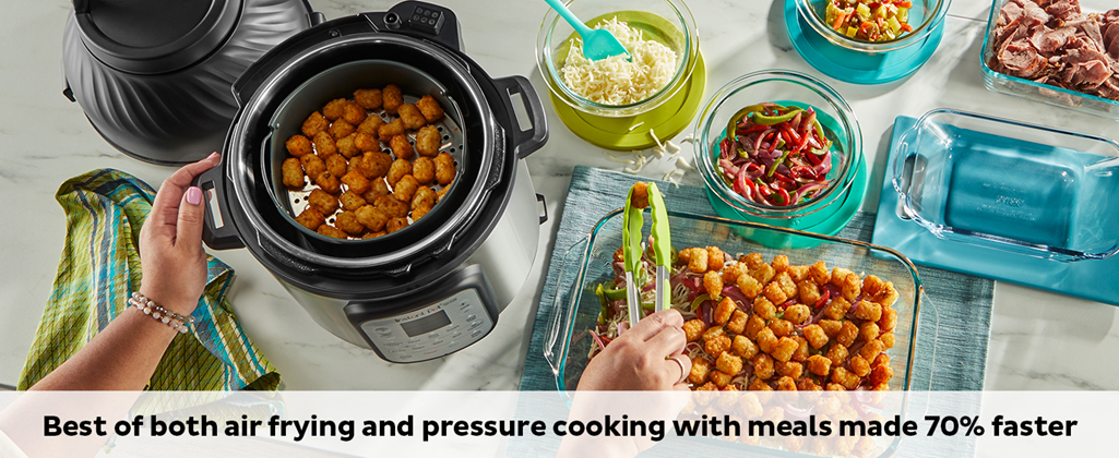 From the makers of the Instant Pot Duo™ series comes a pressure cooker with air frying capabilities. Pressure cook delicious one-pot meals up to 70% faster than traditional cooking methods, slow-cook foods to tender perfection just like grandma used to make and get all the crunch from deep-frying but with 95% less oil in one multi-cooker. Seamlessly transition from pressure cooking and slow cooking to air frying with the included removable air fryer lid. With 15 built-in smart programs, you can prepare even more of your favorite dishes with the press of a button. Redefine cooking and enjoy quick and easy meals anywhere, any time. The Instant Pot Duo Crisp offers the quality, convenience and versatility you’ve come to expect from Instant – discover amazing.