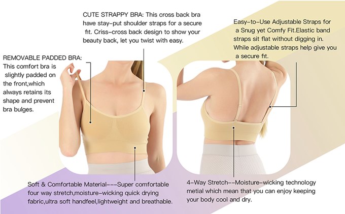 - Adjustable Straps---Adjustable strap bra design supports you throughout your day or during exercise without digging or pinching.4 Strengthen straps for additional support.Removalbe soft pads for the bralettes portion can be removed when you need wash.This sexy athletic bra cup pad can be easy to put in and out.Full figure design not only effectively protect against shock,prevent the bra from shifting,but also beautify your back curve,increase the fashion sexy style.