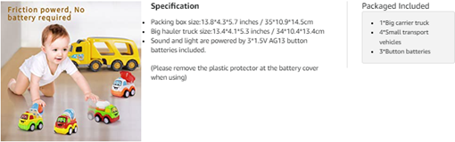 • Friction & Turnable & Removable: Just push and let it go,the hauler truck will carry four small engineering vehicles and set off! The head of the big carrier can also turn. After reaching, separate the cab and the traction compartment, and then open the tailgate to transport vehicles down. Pull the small vehicle back, the force of return allows them drive fast to start a construction job! Easy to play toys for baby.