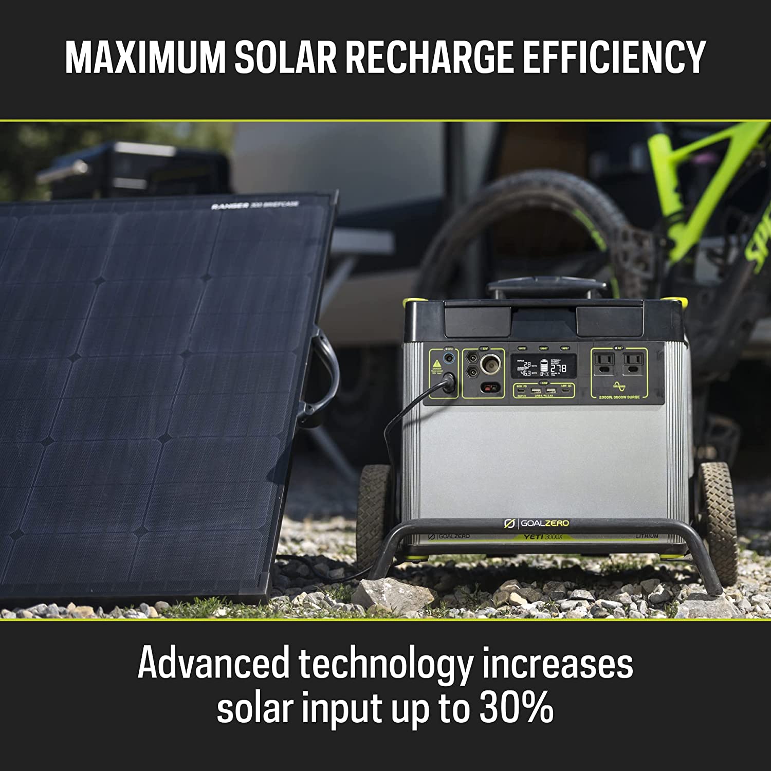 - RECHARGE WITH SOLAR: Maximize your solar input with Goal Zero’s MPPT (Maximum Power Point Tracking), which increases solar input by up to 30 percent. Turn your Yeti 3000X into a solar generator when you choose from our lightweight Nomad Solar Panels for portability, our durable Boulder series, or our Boulder installation models for semi-permanent or permanent installation.