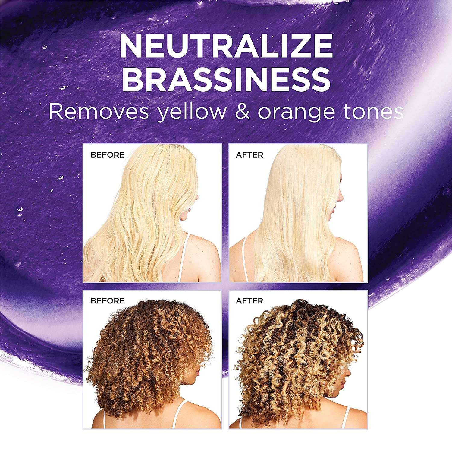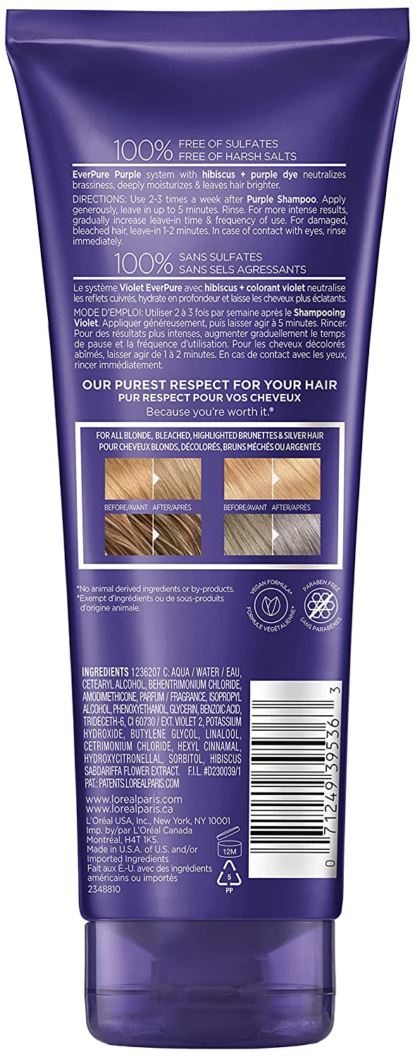 - L'Oreal Paris EverPure Sulfate Free Purple Shampoo and Conditioner provides color protection and corrects brassy blonde with yellow and orange tones
