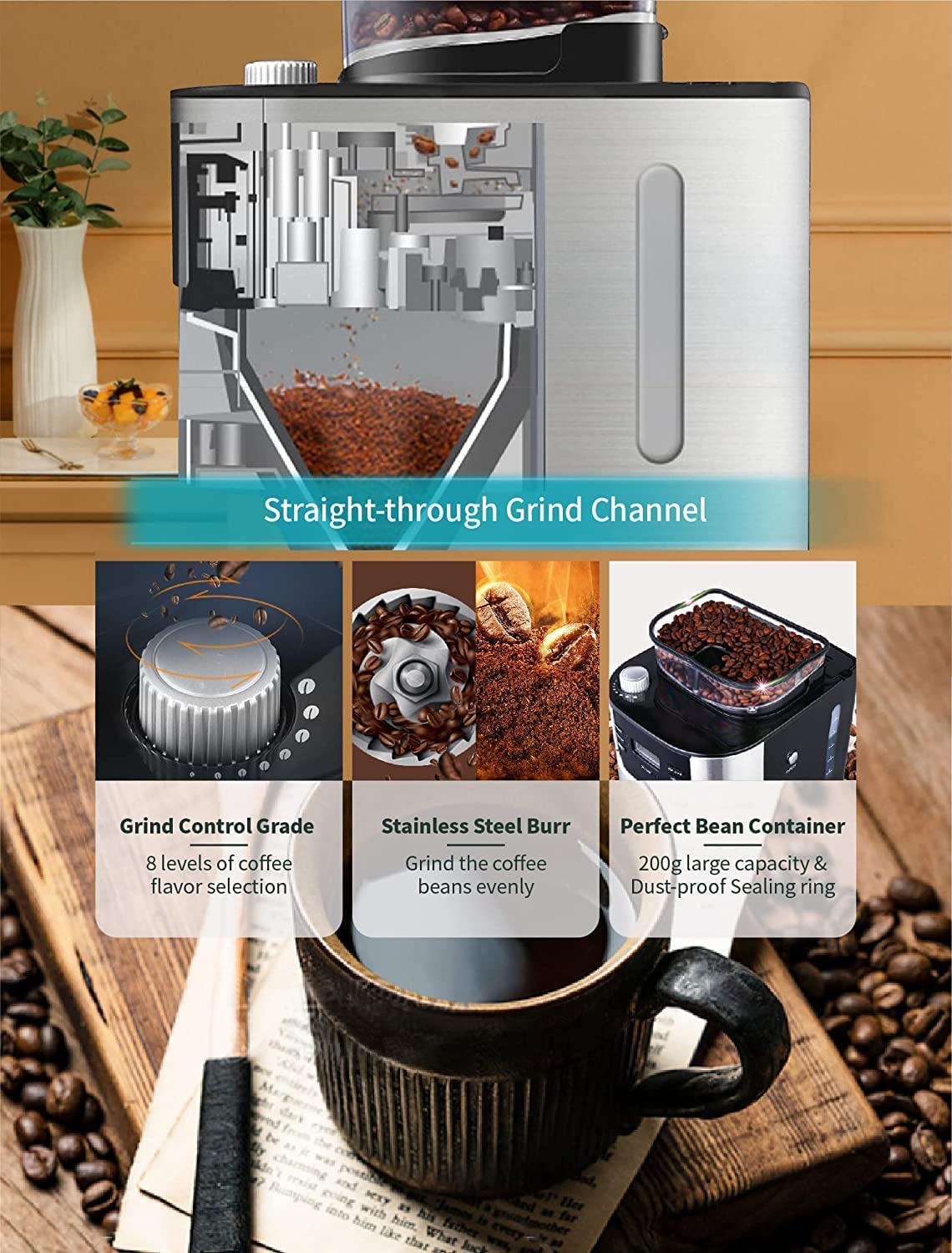 - ☕ 【EASY TO OPERATE】: Depending on your personal preference, choose coffee beans or coffee powder to make drip coffee. The coffee machine is equipped with a burr grinder, so you can brew a cup of fresh coffee with coffee beans. The coffee beans are gathered and ground by the burr grinder, retain the full flavor of the beans, then the coffee powder will fall directly on the filter.