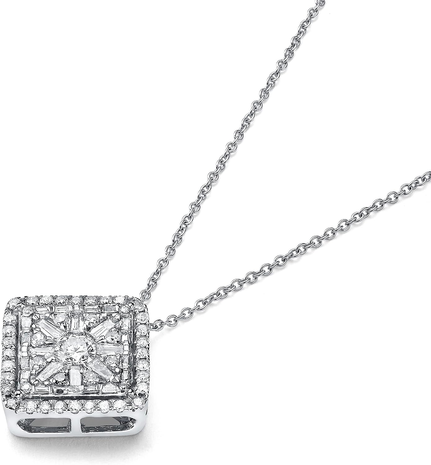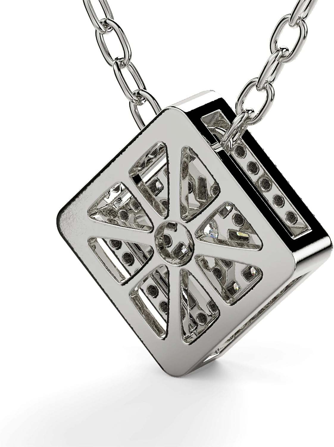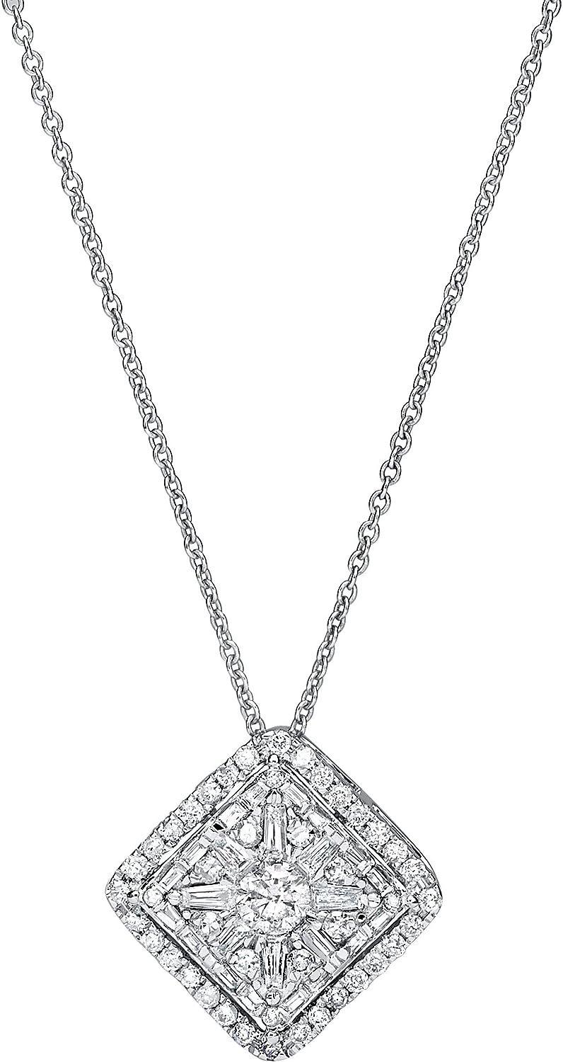 14K White Gold Diamond Pendant Necklace, 0.60 TCW Pave Setting Natural Elegant (SI2-I1, F, Very Good Cut) Round & Baguette Cut Diamonds, Width 5 mm, Height 12.10mm, Length 12.10mm, Jewelry For Women