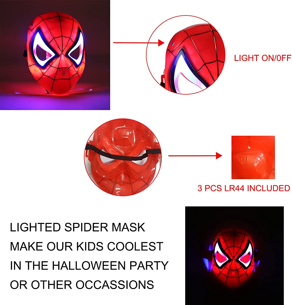 REAL SUPERHERO COSTUME LED MASK,EYE MASK AND CAPE:Wear the Superhero Eye Mask or the Led Mask(ligh on/off),Dress on the Superhero Cape,Put on the spider web red glove,our boys girls are the most cool superhero.With this full superhero costume set,our kids are ready to join Birthday party,Halloween or Christmas Party etc.