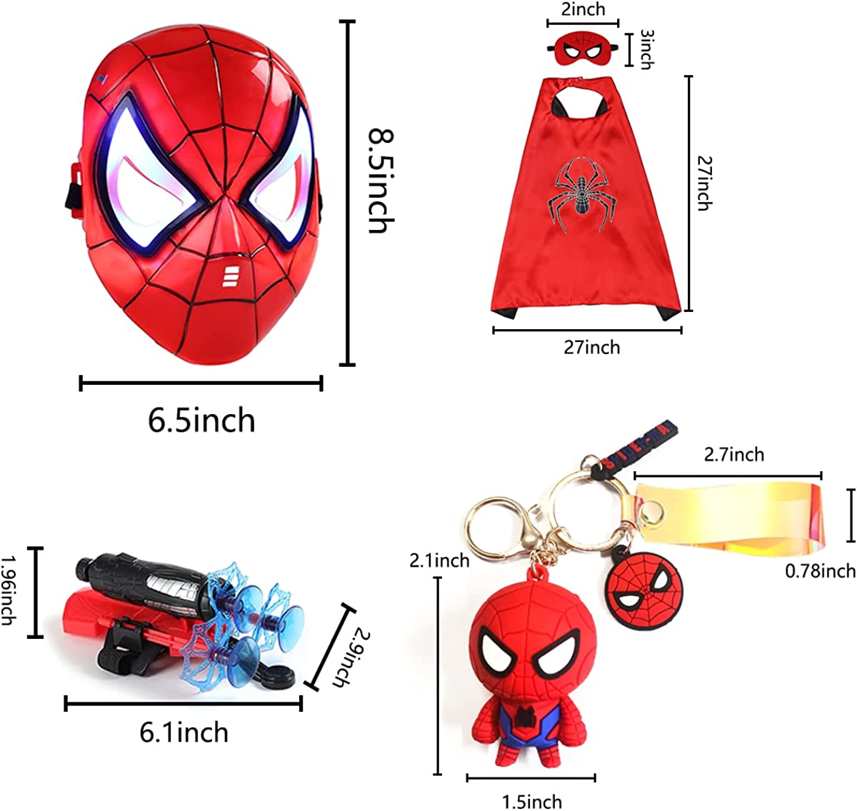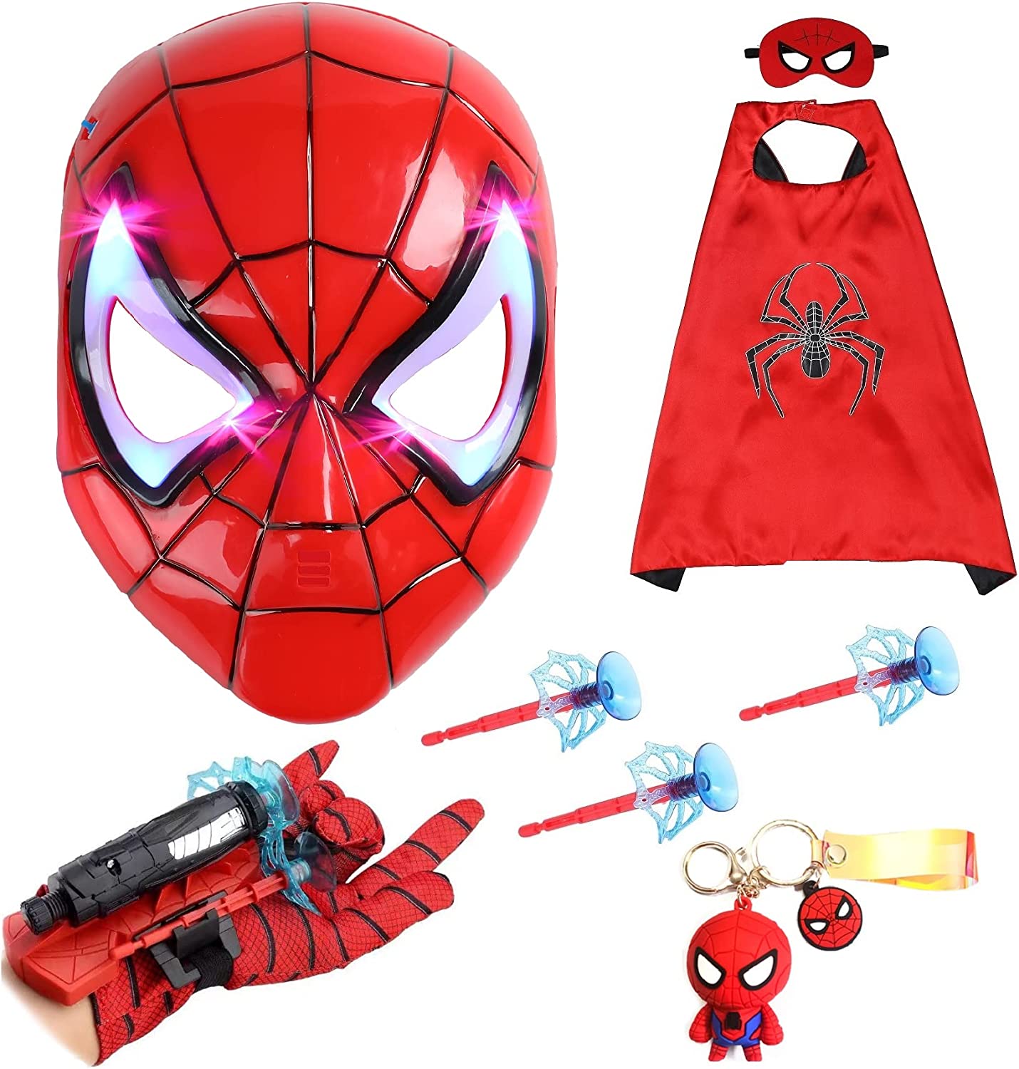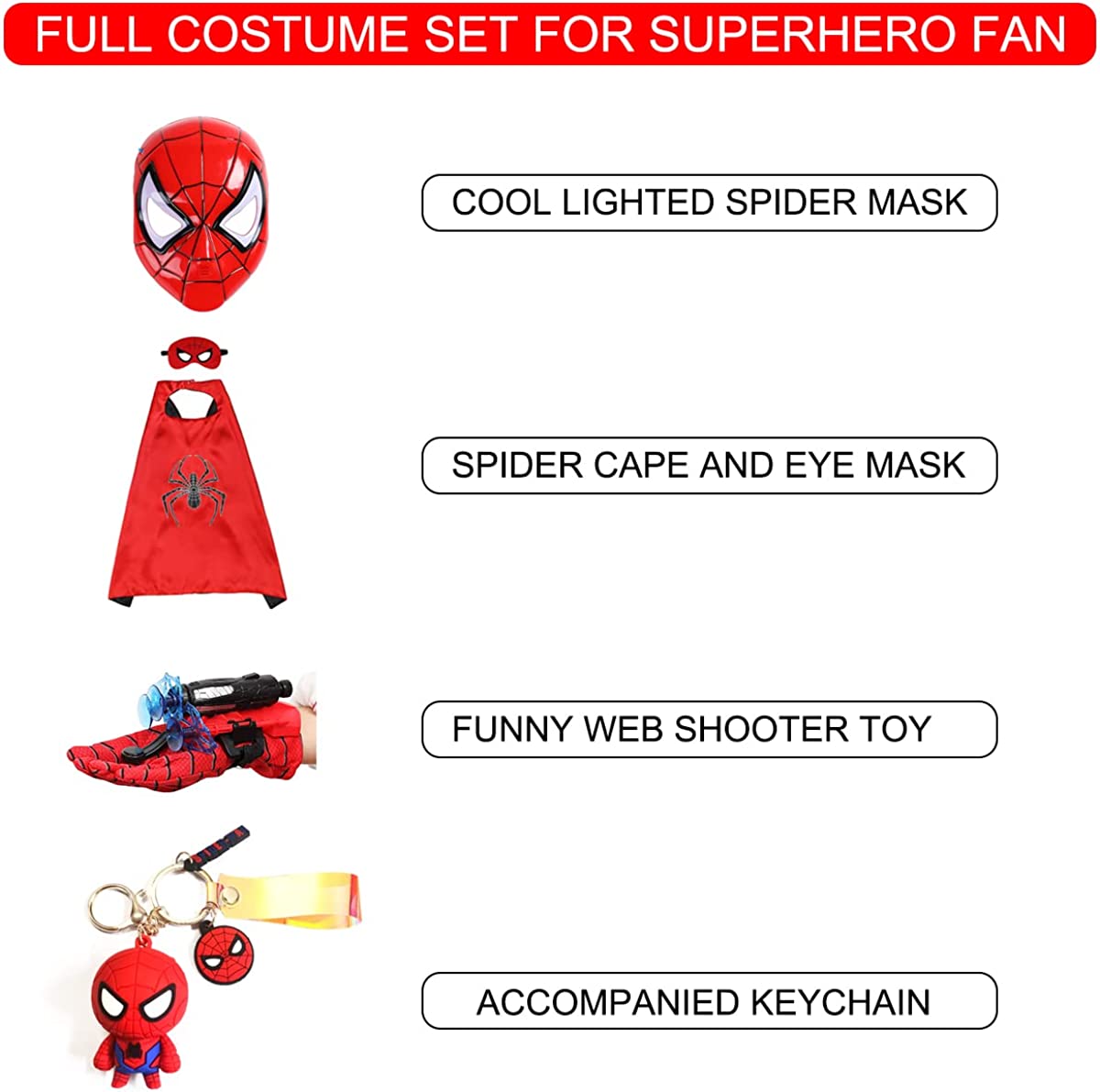 DREAMING SUPERHERO PLAYSET FOR KIDS: 1PC Web Shooter with 3 toy launchers,1PC Led Mask,1PC Superhero Cape,1PC Felt Eye Mask,1PC Spider Toy Keychain for Backpack